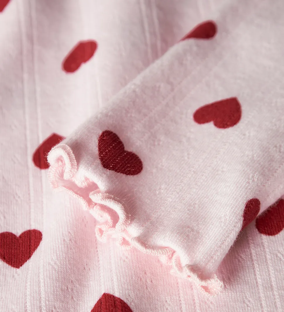 Charmerende Name It bluse i lyserød med et mønster af røde hjerter samt et diskret hulmønster. Blusen har lange ærmer og en rund halsudskæring. Stoffet viser en let struktureret overflade, der giver et ekstra detaljerigt look. Den afslappede kant nederst tilføjer en fin detalje, som gør blusen særligt iøjnefaldende. Name It skaber her et stilrent design med et sødt præg.