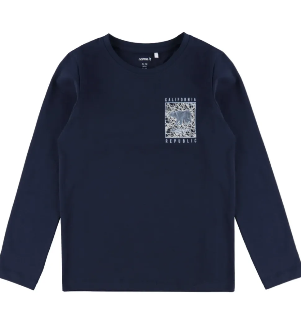 Stilfuld Name It bluse med lange ærmer. Den er navyblå med et enkelt print på brystet, der viser en bjørn og teksten “California Republic.”