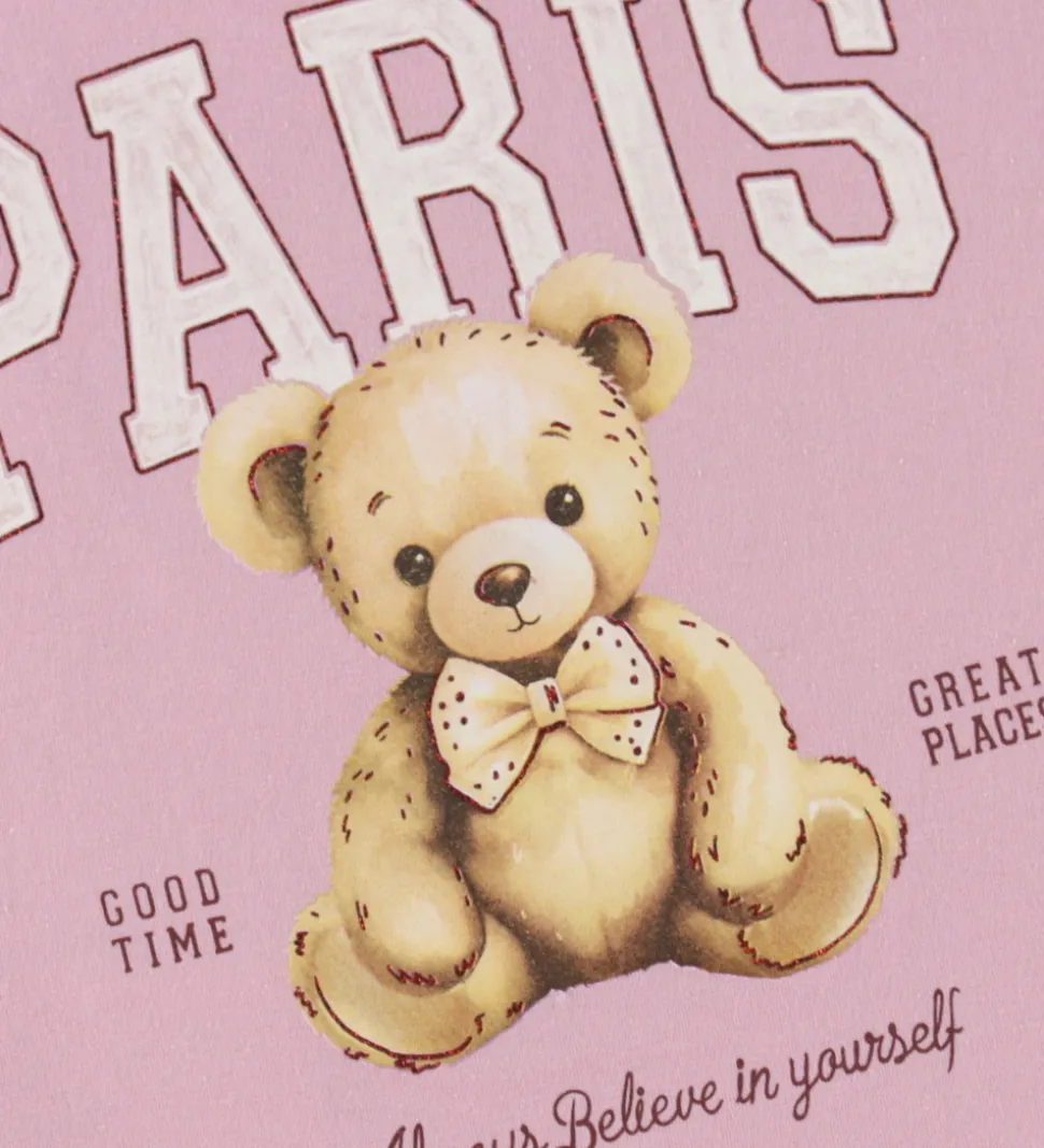 Elegant Name It bluse i en sart rosa nuance med lange ærmer. Blusen har et tekstprint på forsiden, og på ryggen er et stort print med en bamse og glimmerdetaljer. Name It blusen er designet med en rund halsudskæring, der giver et enkelt og tidløst udtryk.