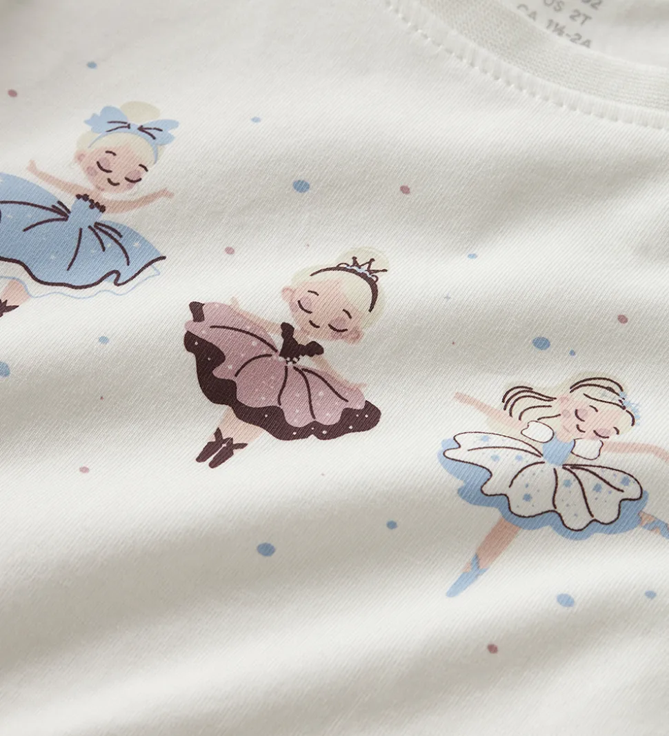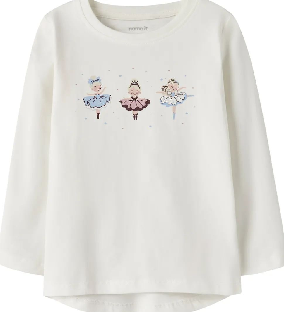 Charmerende Name It bluse med lange ærmer i hvid. Blusen prydes af et print med tre små ballerinaer i forskellige farver. Designet inkluderer en rund halsudskæring, der giver et klassisk udtryk. Name It blusen fremhæver et sødt og enkelt look, der passer til mange lejligheder.