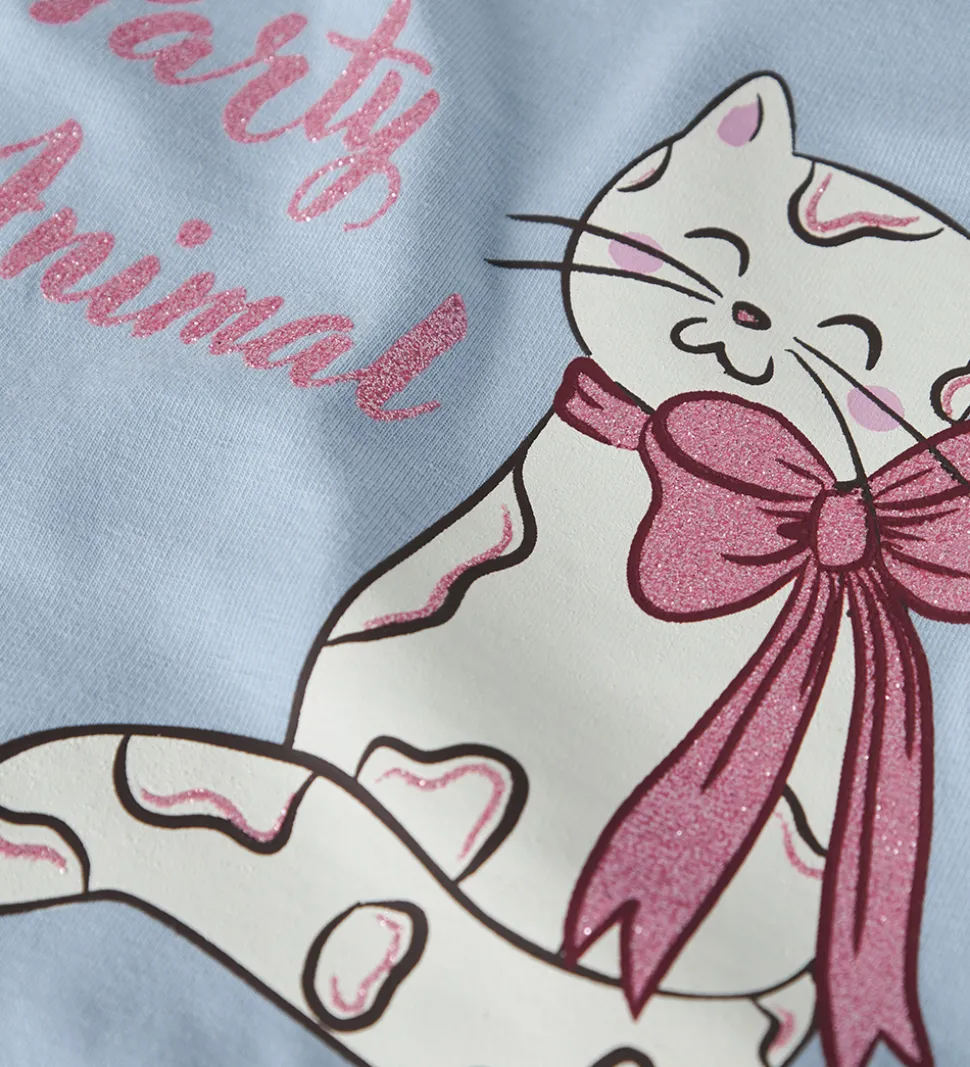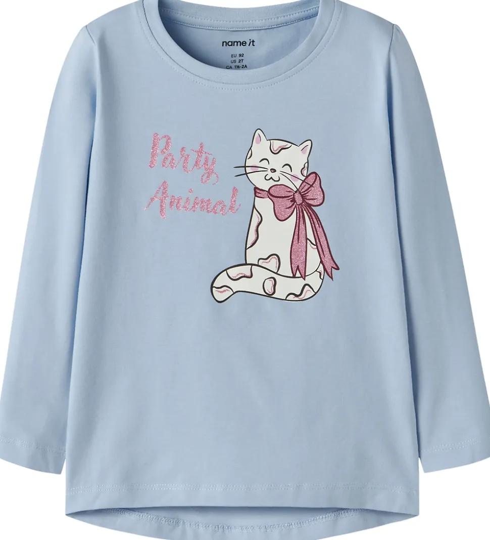 Flot bluse fra Name It i lyseblå med print på fronten af en kat med en stor sløjfe og teksten “Party Animal” i pink glimmer. Blusen har en rund halsudskæring og lange ærmer.