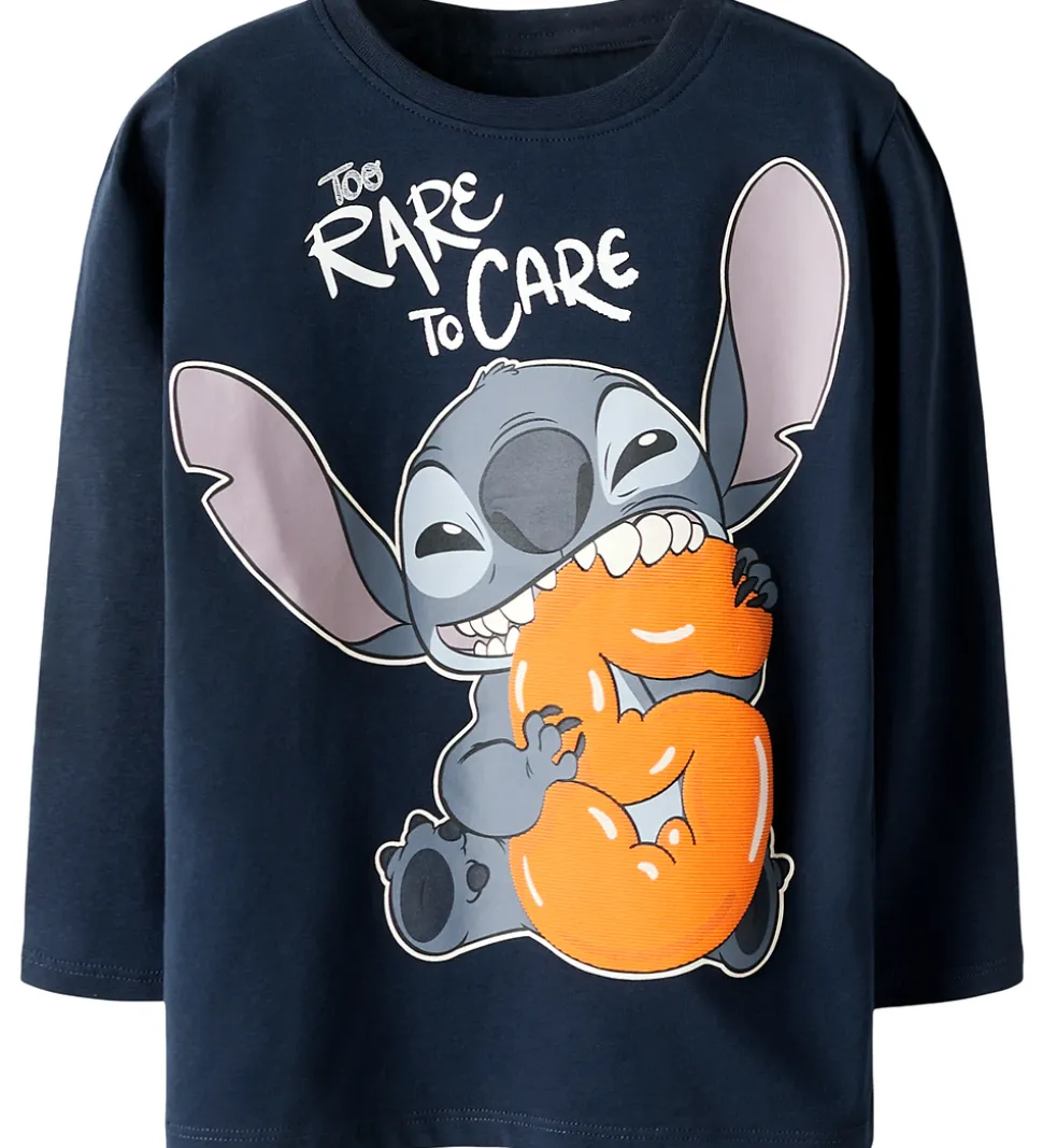 Fin Name It bluse i mørkeblå med lange ærmer. Foran er et stort print af Stitch, der holder et orange objekt. Over printet står teksten “Too Rare to Care”. Blusen fra Name It har en rund halsudskæring, som giver et enkelt udtryk.