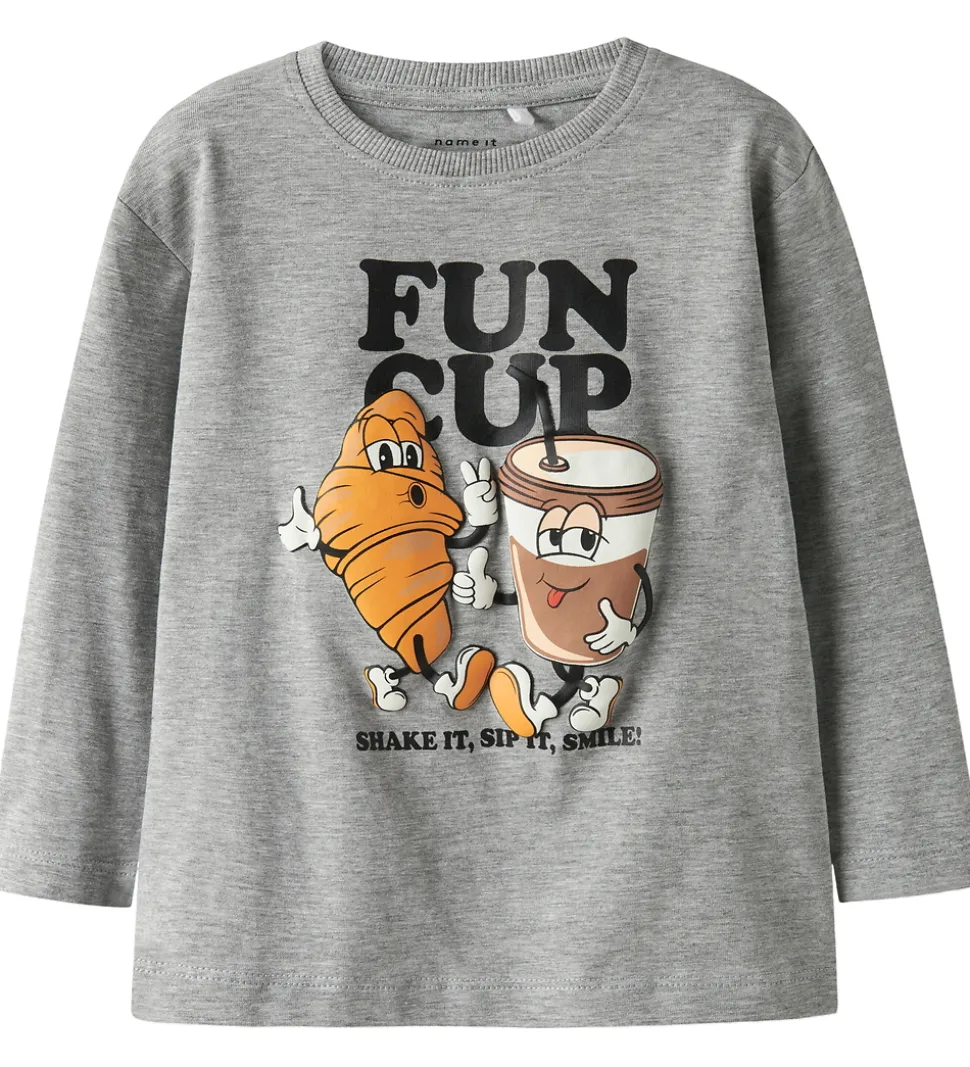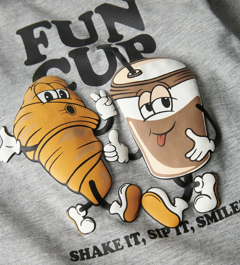 Charmerende Name It bluse i gråmeleret med et sjovt print på fronten af to animerede figurer, en croissant og en kaffekop og teksten “Fun Cup”. Blusen har en rund halsudskæring med en smal ribkant og lange ærmer.