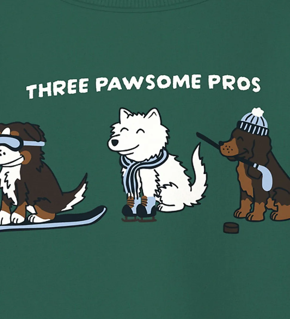 Skøn Name It bluse i mørkegrøn med print på fronten af tre hunde med vintertøj og teksten “Three Pawsome Pros”. Blusen har en rund halsudskæring med en smal ribkant og lange ærmer.