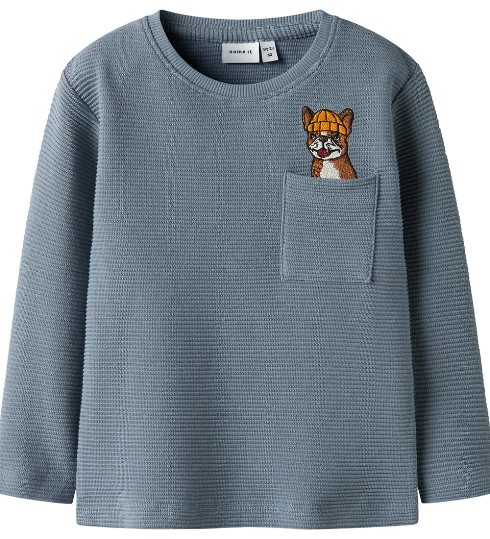 Charmerende Name It bluse i en afdæmpet blå nuance med vandret ribstruktur. Blusen har lange ærmer samt en rund halsudskæring. På brystet findes en lille lomme og en broderet detalje af en hund iført hat, som tilføjer et sjovt og sødt element til det stilrene design.