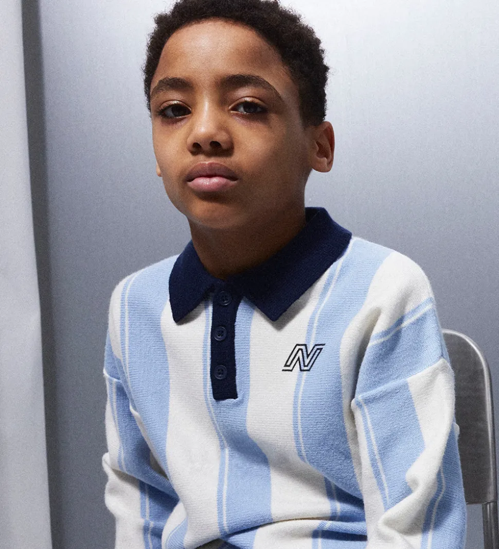 Stilfuld Name It bluse i stribet hvid og lyseblå med detaljer i navyblå og et navyblåt “N” på venstre bryst. Blusen har en strikket struktur med en klassisk krave og tre knapper fortil. Den har lange ærmer med ribkanter. Blusen er fremstillet af viskose, polyester og nylon, som gør den meget blød og behagelig.