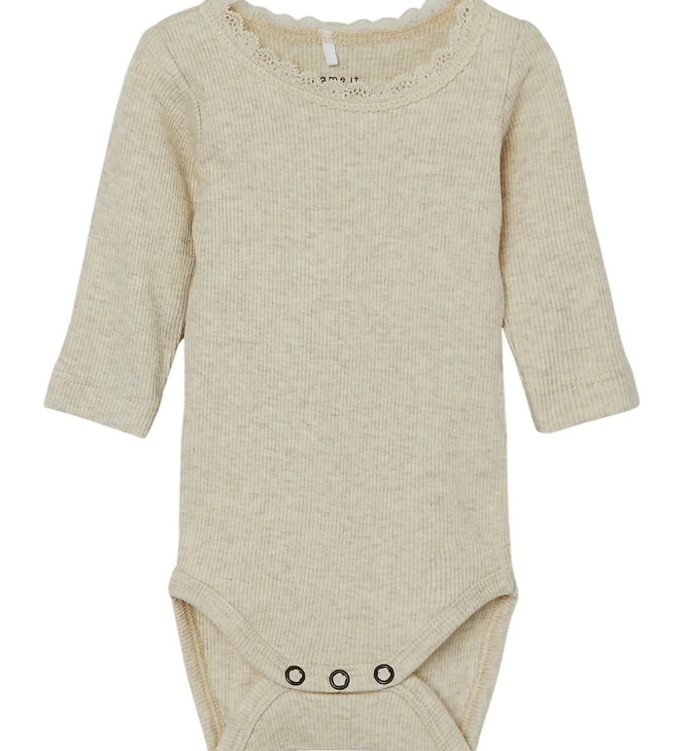 Flotte Name It bodyer solgt i en 2-pak i ensfarvet og meleret beige med ribstruktur. Bodyerne har en rund halsudskæring med fine blondekanter og en trykknap ved venstre skulder. De har lange ærmer og lukkes med trykknapper mellem benene.