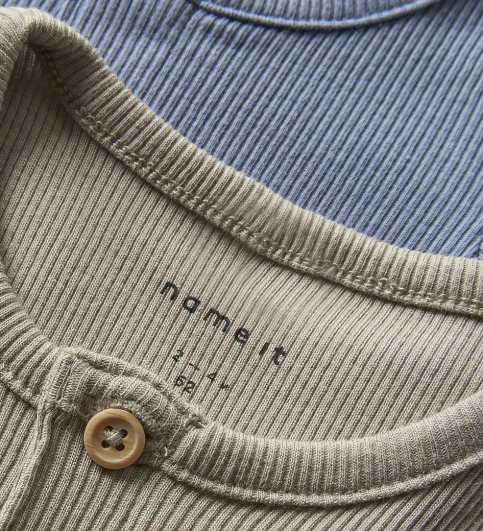 Flotte Name It bodyer solgt i en 2-pak i ensfarvet blå og støvet lysegrøn med ribstruktur. Bodyerne har en rund halsudskæring med knapper foran. De har lange ærmer og lukkes med trykknapper mellem benene.