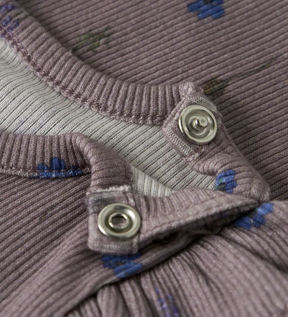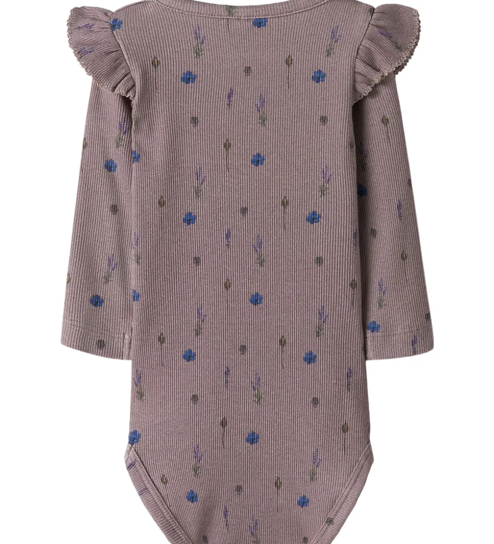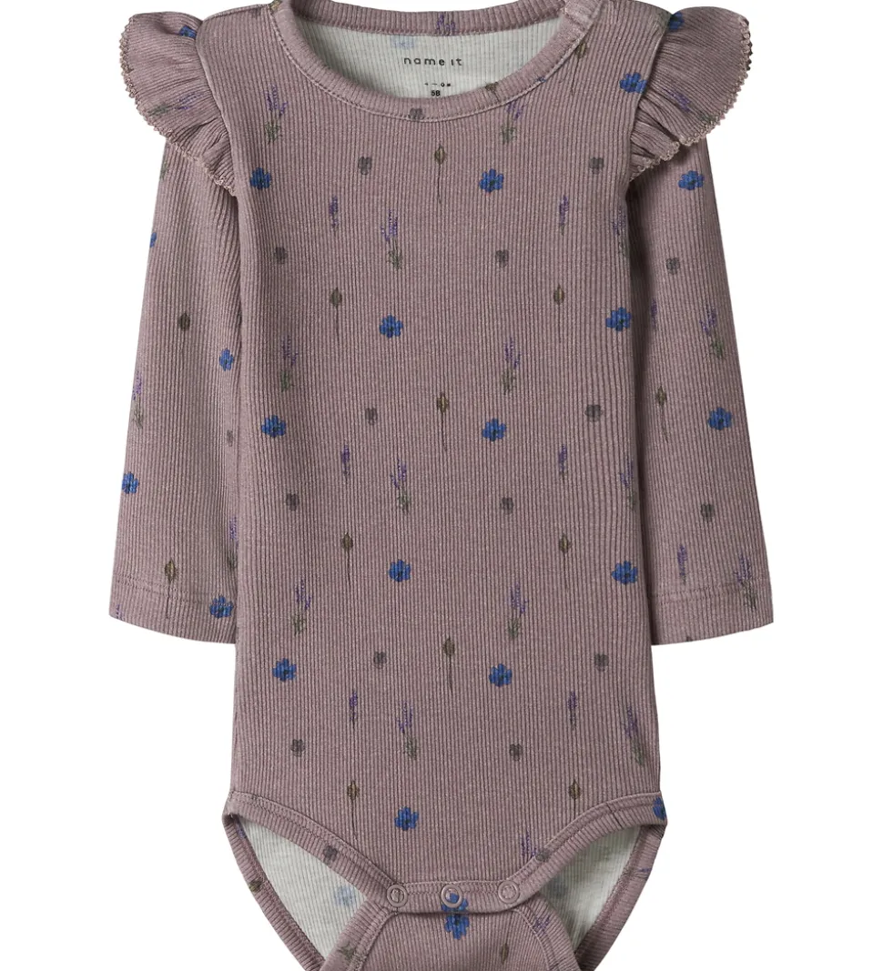 Charmerende Name It body med lange ærmer i en støvet lilla nuance med delikate blomsterprint. Bodyen har elegante flæsedetaljer ved skuldrene, som giver et sofistikeret touch. Det ribstrikkede stof giver en flot struktur til kroppen.