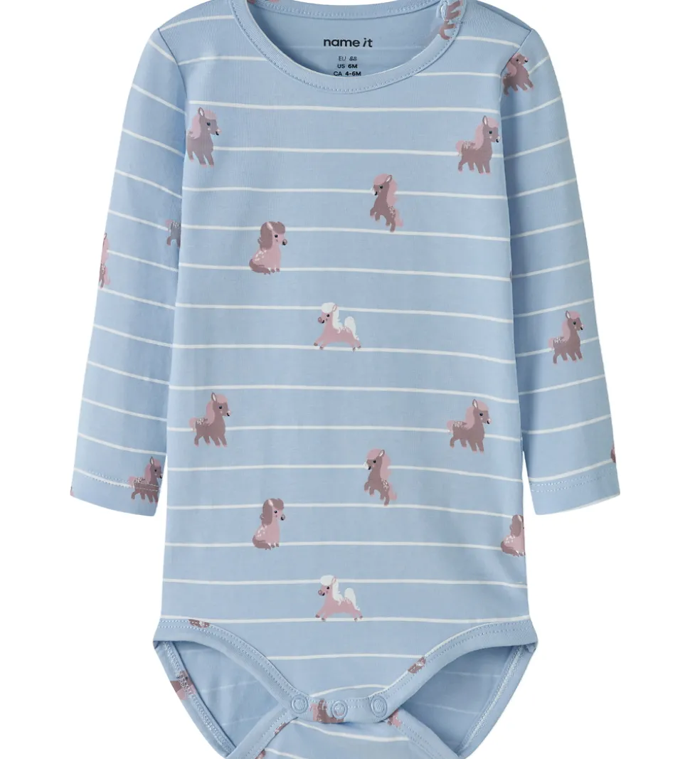 Flot Name It body med lange ærmer i en behagelig lyseblå nuance. Bodyen har et charmerende print med små rosa og brune heste mellem hvide striber.