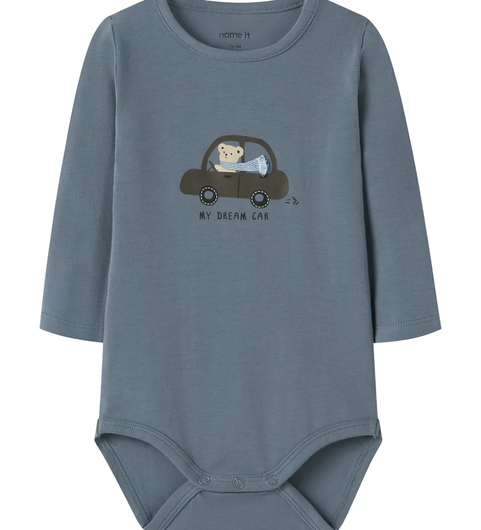 Charmerende Name It body med lange ærmer i en dyb blå nuance. Forsiden prydes af et sødt print med en bjørn, der sidder i en bil med teksten “My Dream Car” nedenunder.