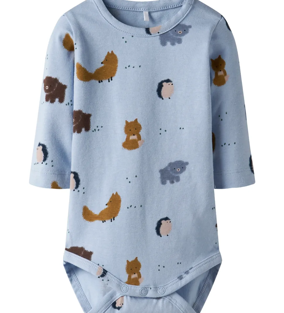 Sød Name It body i lyseblå med dyreprint. Name It bodyen har en rund halsudskæring med en trykknap ved venstre skulder og lange ærmer. Den lukkes med trykknapper mellem benene.