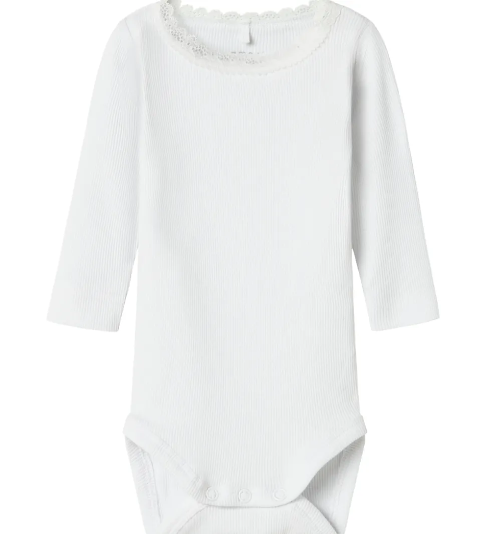 Fin Name It body i hvid med ribstruktur. Bodyen har en rund halsudskæring med en elegant blondekant og lange ærmer. Den lukkes mellem benene med trykknapper.