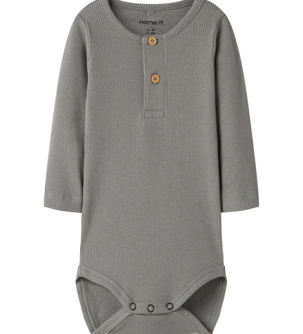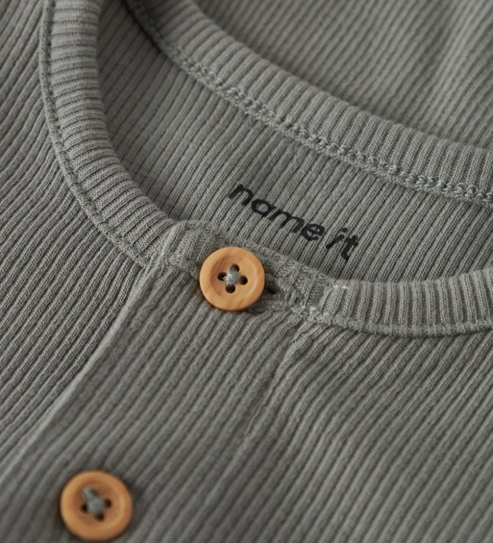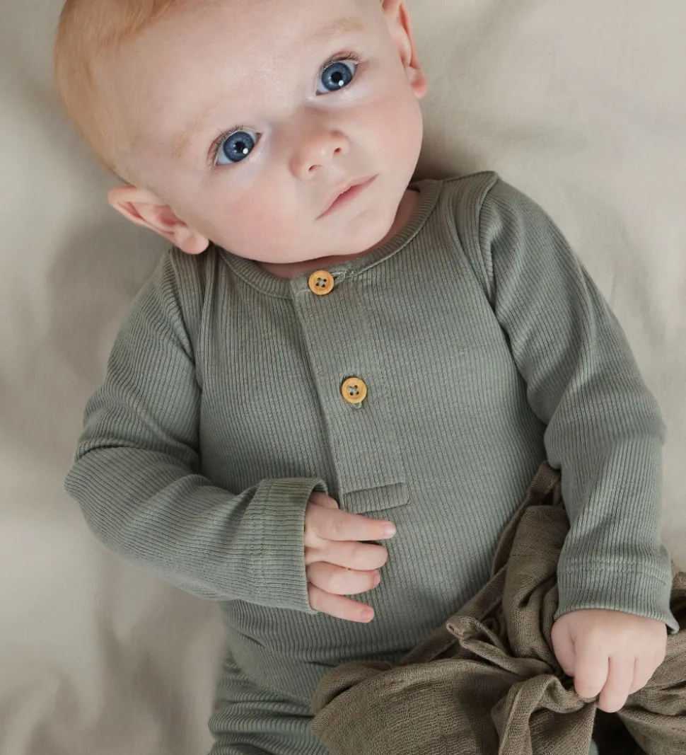 Smart Name It body i støvet grøn med ribstruktur. Bodyen har to knapper foran og lange ærmer. Den lukkes med trykknapper mellem benene.