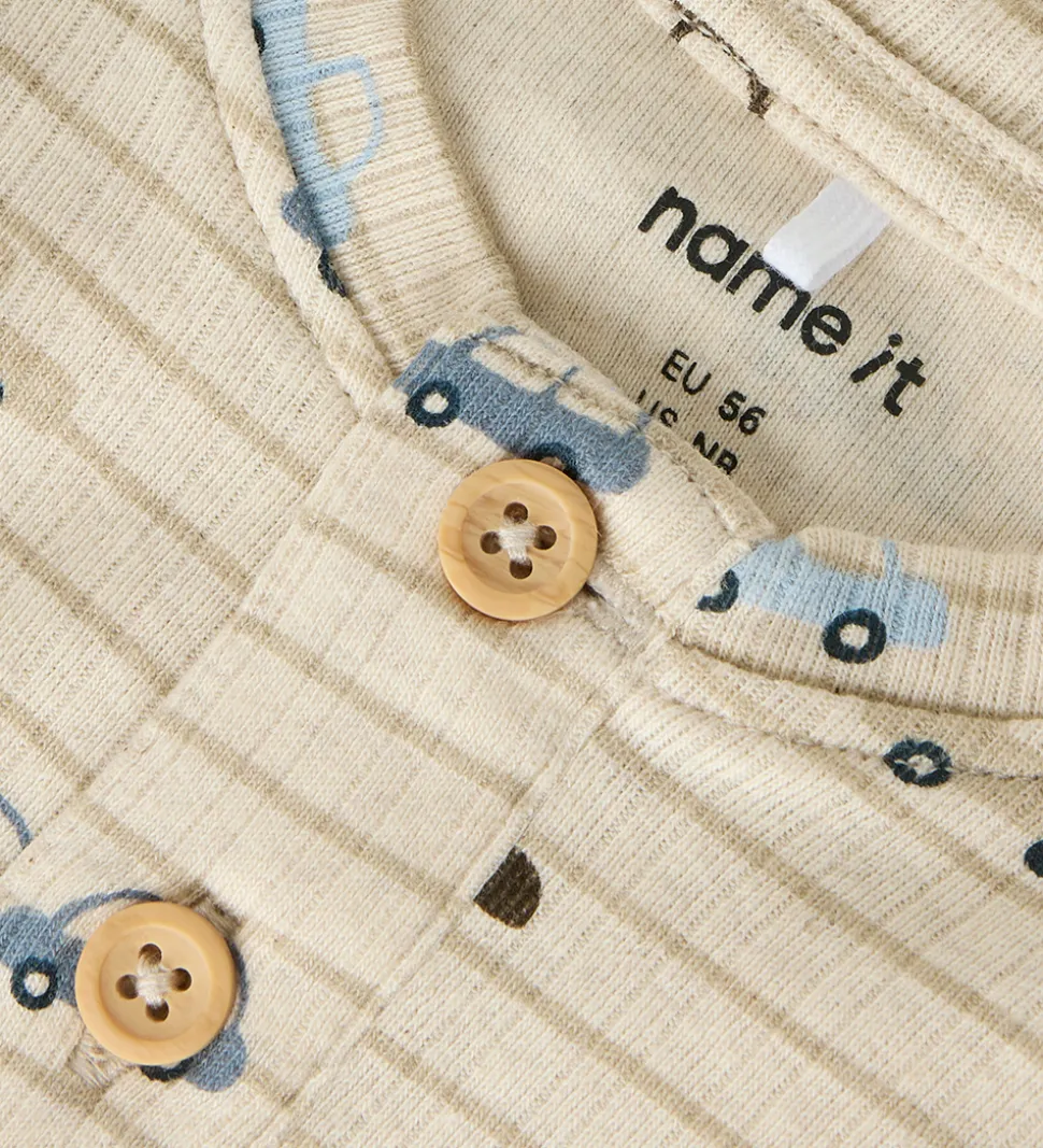 Fin Name It body i beige med vandrette striber i en mørkere nuance og et alloverprint af biler i blå og brune nuancer. Bodyen har ribstruktur og en rund halsudskæring med to knapper foran. Den har lange ærmer og lukkes mellem benene med trykknapper.