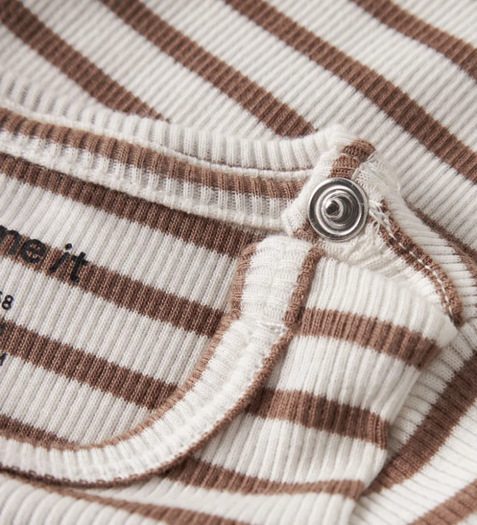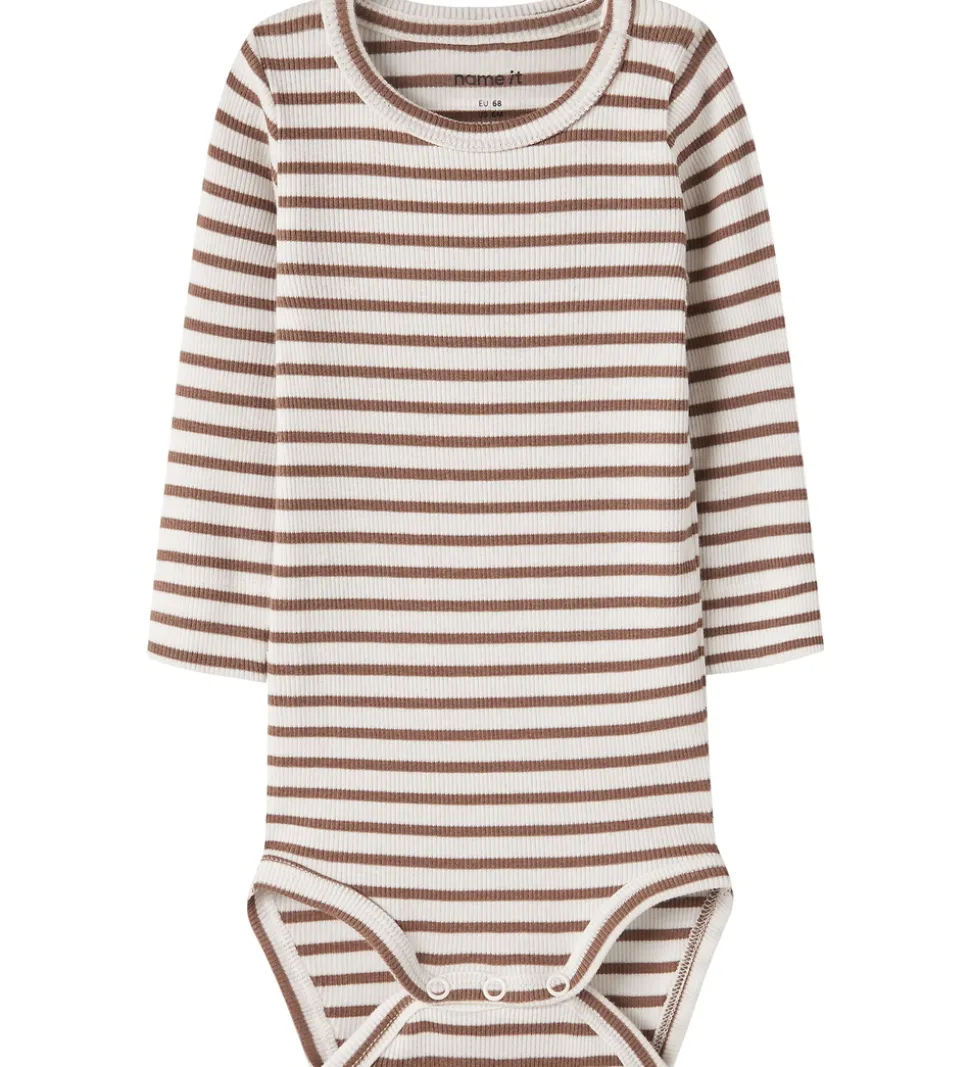Flot Name It body med lange ærmer i et stribet mønster i hvid og brun. Bodyen har ribstruktur og en rund halsudskæring med en trykknap ved venstre skulder. Den lukkes med trykknapper mellem benene.