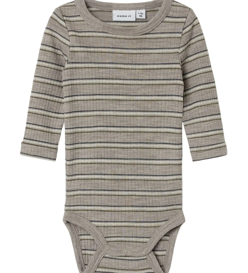 Skøn Name It body i gråbrun med ribstruktur og vandrette striber i blå, hvid og grøn. Bodyen har en rund halsudskæring og lange ærmer. Den lukkes med trykknapper mellem benene. Bodyen er fremstillet af merinould og modal.