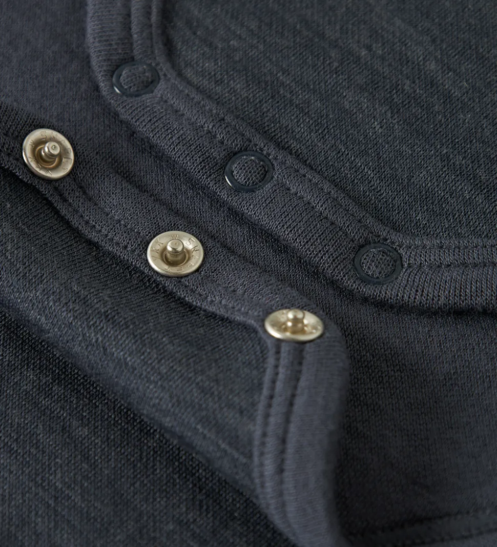 Praktisk Name It body i meleret mørkeblå med en lille, hvid applikation på venstre ærme. Bodyen har en rund halsudskæring med trykknapper foran, og lange ærmer med en lomme øverst på venstre ærme. Den har brede ribkanter ved håndleddene, og lukkes mellem benene med trykknapper. Bodyen er fremstillet i en blød blanding af merinould og viskose.