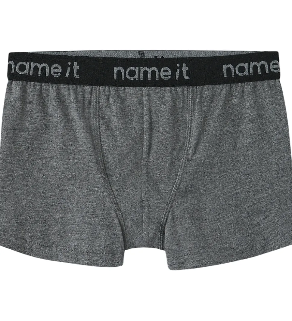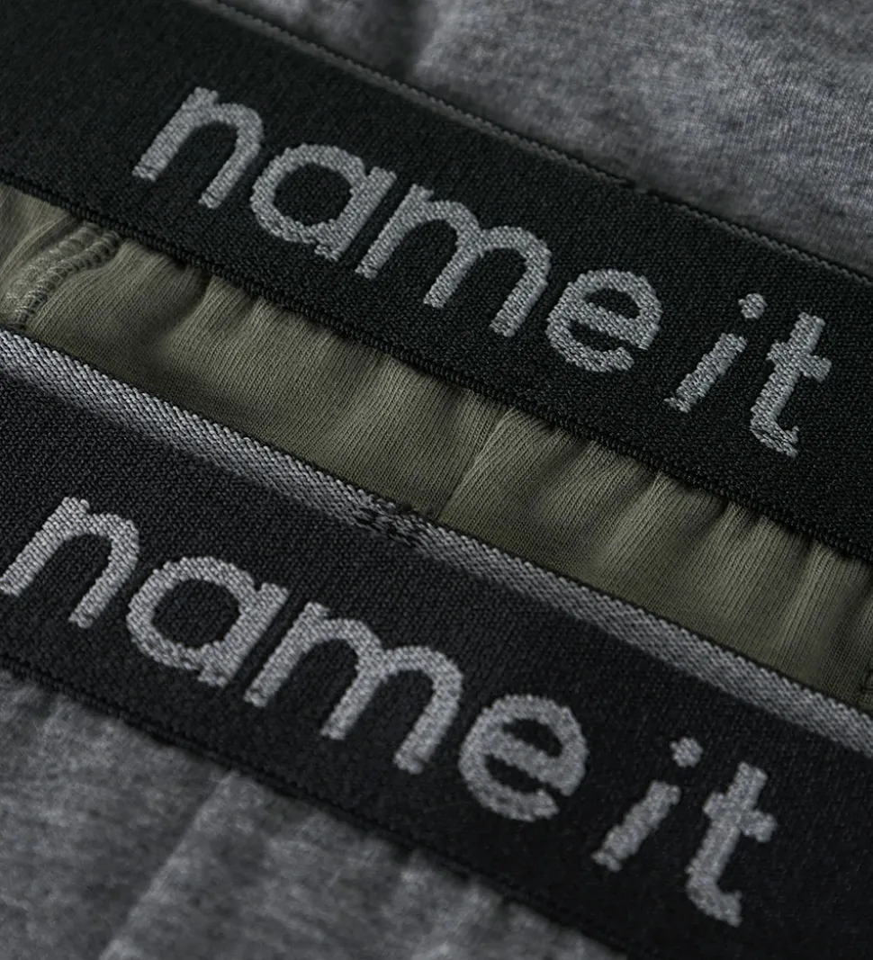 Praktiske Name It boxershorts i en pakke med tre par. Boxershortsene kommer i forskellige nuancer: to par i grå og et par i olivengrøn. Name It boxershorts har en elastisk kant med hvidt logo, som sikrer en behagelig pasform.