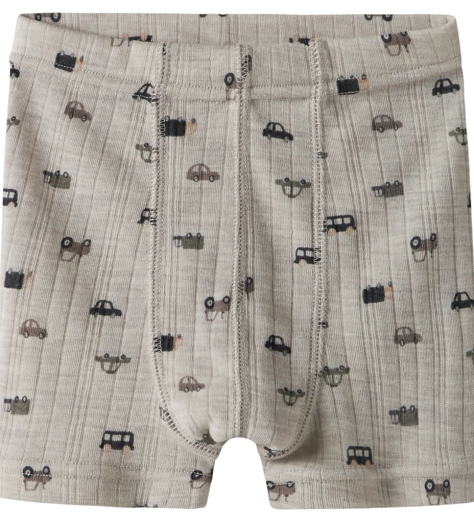 Smarte Name It boxershorts i gråbeige med print af biler i blå, grønne og brune nuancer. Boxershortsene har fin ribstruktur og en god elastik i taljen, som sikrer en behagelig pasform. De er fremstillet i blødt og åndbart merinould.