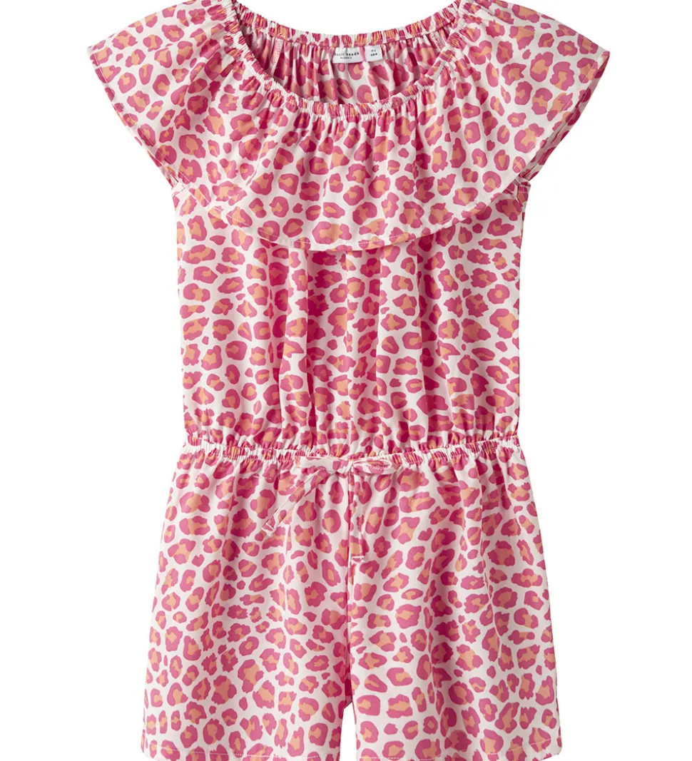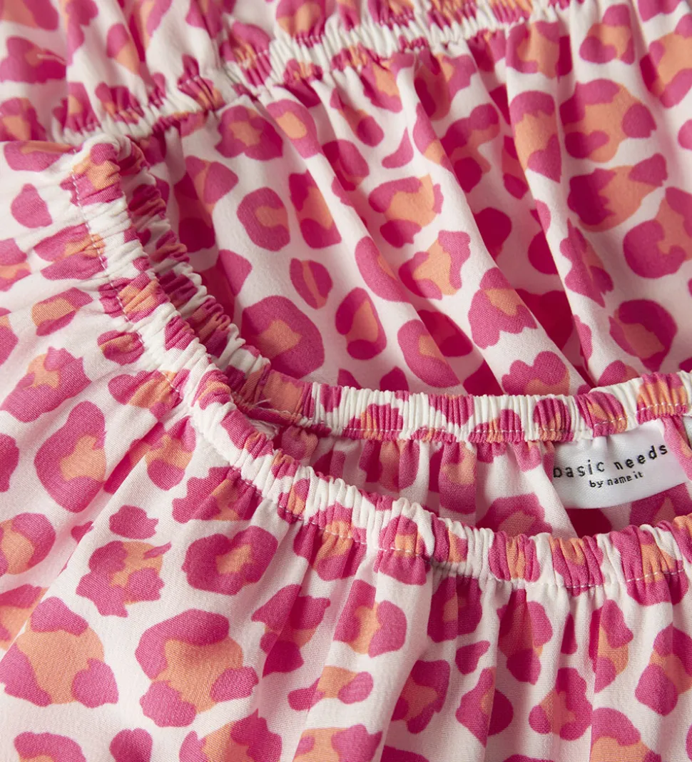 Attraktiv Name It buksedragt med korte ærmer i en lys pink farve med fint leopardprint. Buksedragtens smarte design gør den til et stilfuldt valg til varme dage. Name It sikrer komfort og legende stil.