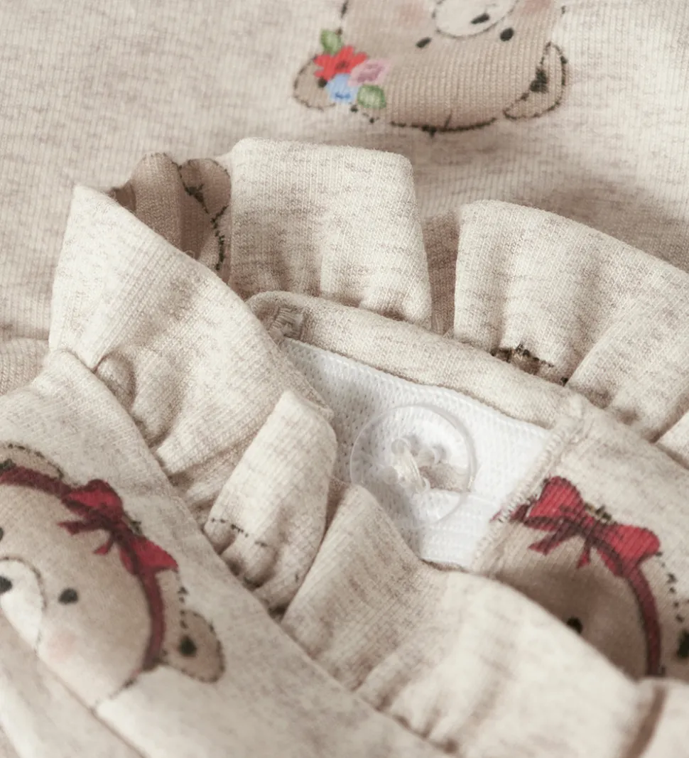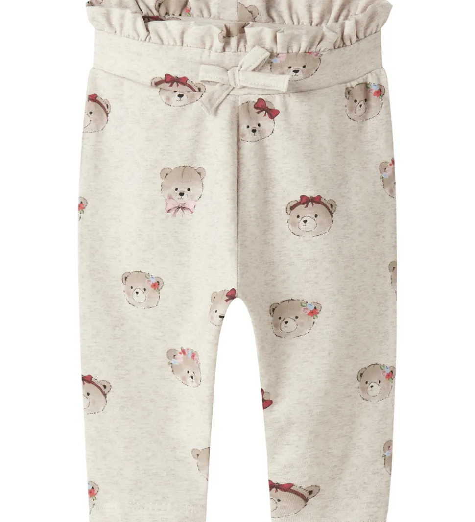 Fine bukser fra Name It i meleret beige med et charmerende alloverprint af bjørneansigter. Name It bukserne har en elastisk talje med dekorative snører og justerbare knapper indvendigt, der sikrer en god pasform. Ved taljen er der en fin flæsekant og buksebenene er afsluttet med fine bølgekanter.