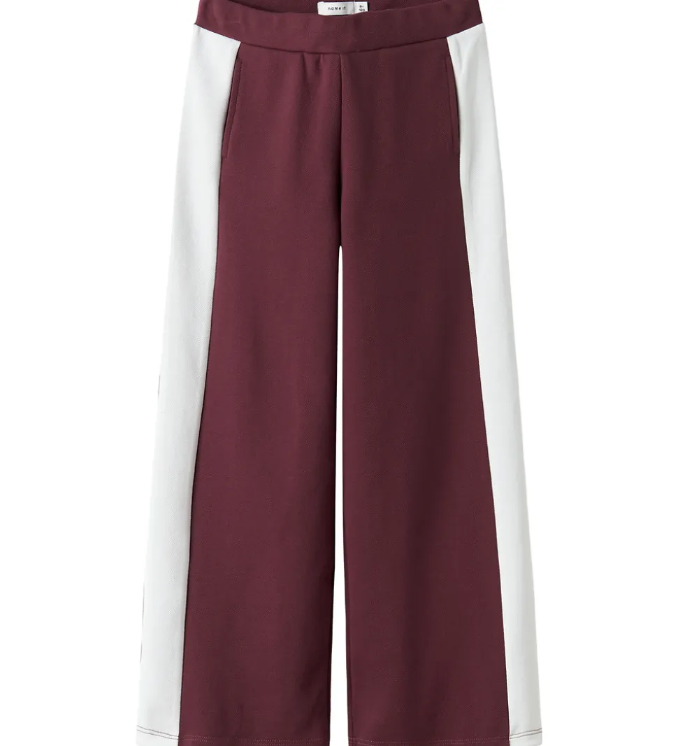 Moderne bukser fra Name It i bordeauxrød piqué med hvide konstraststriber langs siderne. Name It bukserne har en afslappet pasform med brede ben. De har en god elastik i taljen, som kan justeres med knapper indvendigt. Øverst er der en lomme i hver side.