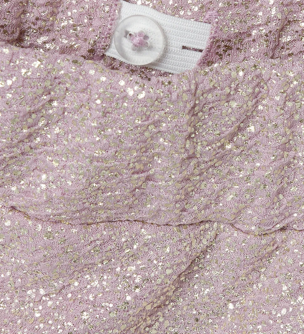 Glitrende bukser fra Name It i rosa med guld glimmer og flot struktur. Name It bukserne har en behagelig, løs pasform og en elastisk talje, der kan justeres med knapper indvendigt.