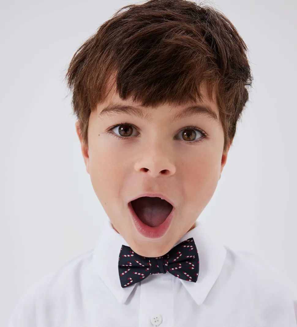 Fin Name It butterfly i mørkeblå satin med en vævet struktur og et fint allover print med julemotiver.