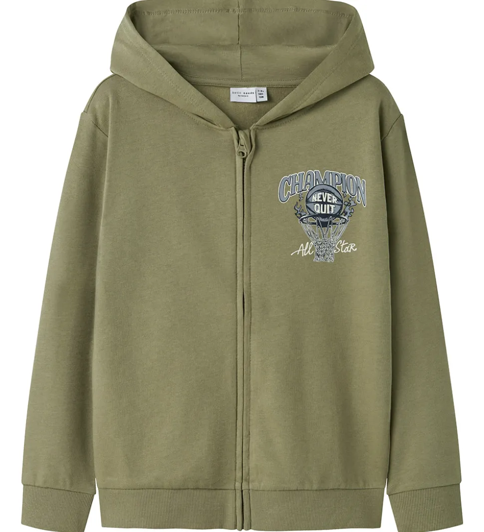 Sej Name It cardigan i olivengrøn med et blåt og hvidt basketballprint på venstre bryst og teksten “Champion, Never Quit, All Star”. Cardiganen er i en lækker sweatkvalitet med en blød hætte og gennemgående lynlås fortil. Indvendigt er der blødt, børstet bomuld.