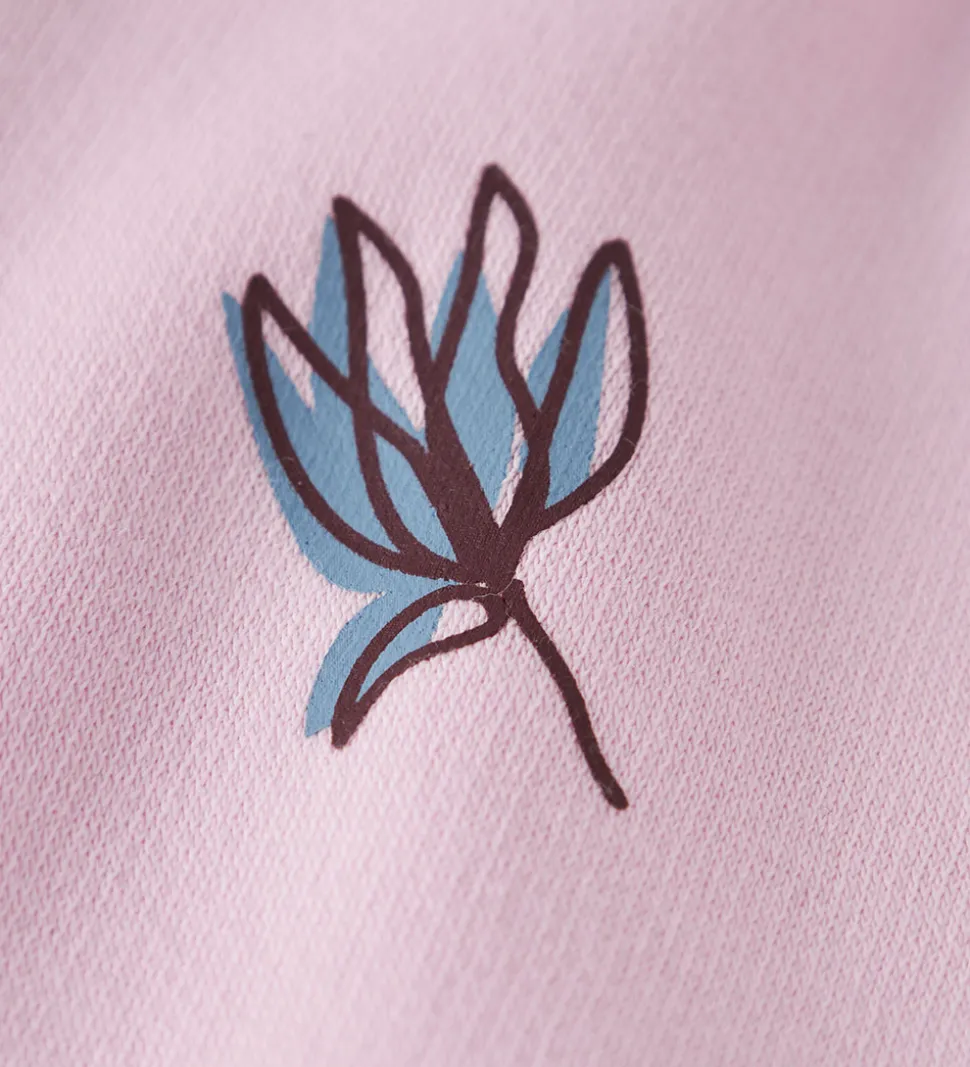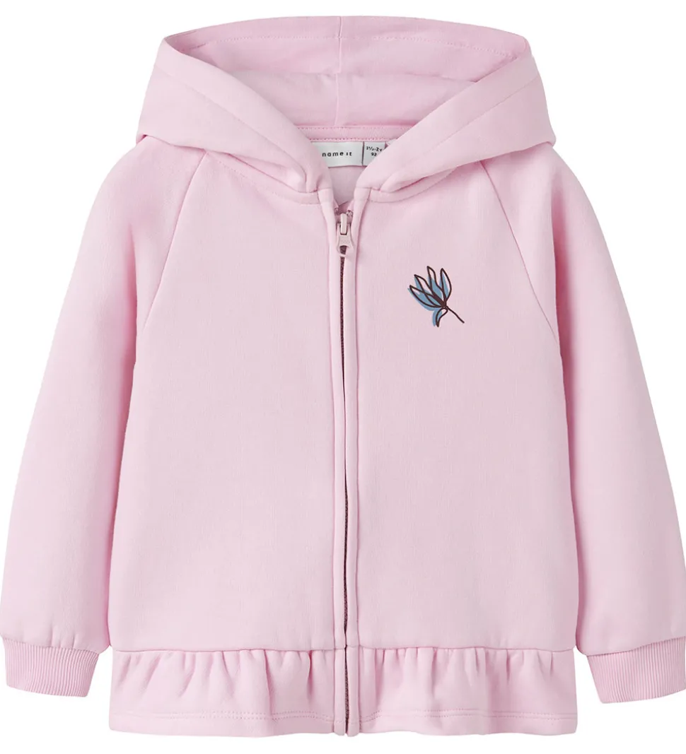 Fin Name It cardigan i rosa med et lille print på venstre bryst af en blomst i blå og brun. Cardiganen er lavet i en blød sweatkvalitet med en hætte og gennemgående lynlås fortil. Den har lange ærmer med ribkanter og en fin flæsekant nederst. Indvendigt er der blødt, børstet bomuld.