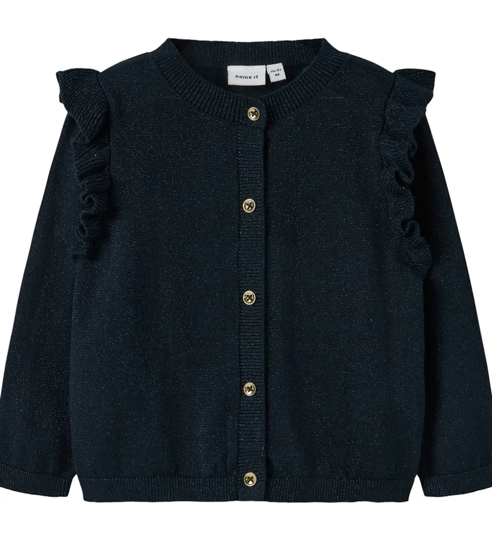 Cardiganen har en elegant strikstruktur med diskret glimmer, der giver et raffineret udtryk. Detailjer som de fine flæser ved skuldrene og knaplukningen med guldfarvede knapper gør Name It cardiganen både stilfuld og unik.