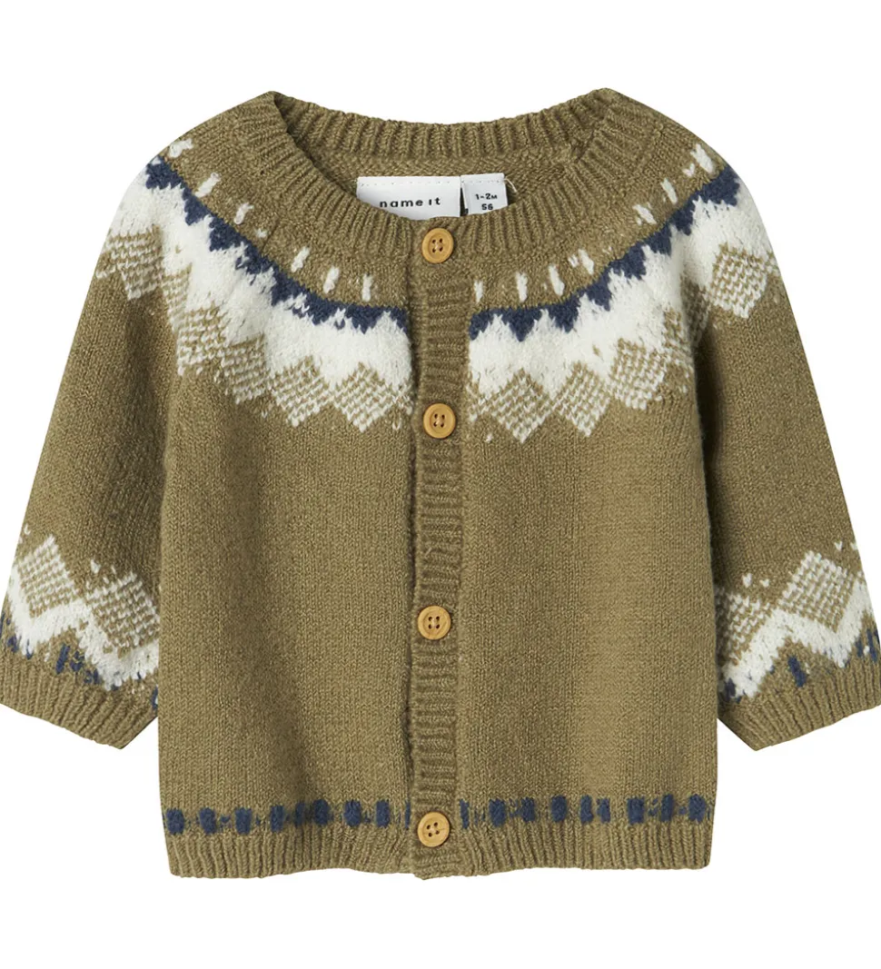 Charmerende Name It cardigan i støvet grøn med mønster i hvid og mørkeblå i toppen, bunden og nederst på ærmerne. Cardiganen har en strikket struktur med en rund halsudskæring og lange ærmer med smalle ribkanter. Den har en praktisk knaplukning foran.