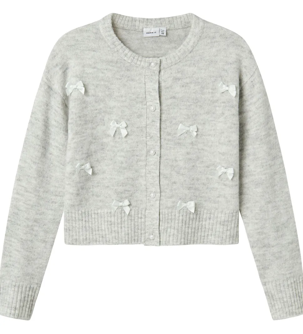 Cardiganen har små, dekorative sløjfer fordelt hen over fronten, hvilket tilføjer en fin detalje til designet. Name It cardiganen lukkes med knapper langs fronten, hvilket gør det nemt at tage den på og af.