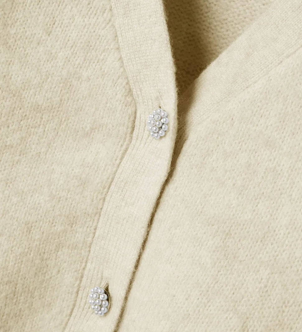 Stilren Name It cardigan i en lys beige med lange ballonærmer. Cardiganen fra Name It har en V-udskæring og lukkes med smukke knapper langs fronten. De brede ribkanter ved håndleddene og nederst på cardiganen giver et struktureret udtryk.