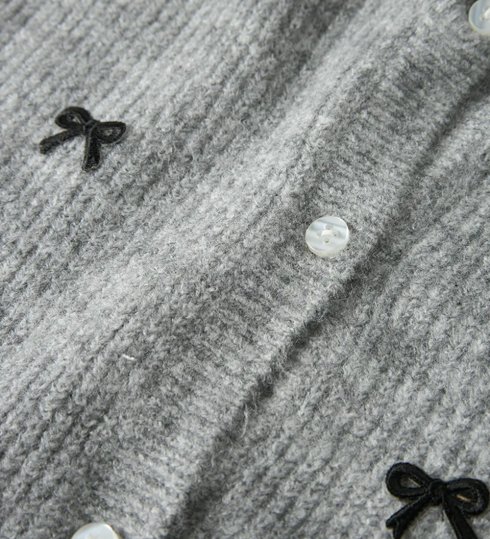 Flot Name It cardigan i gråmeleret strik med små applikationer af sorte sløjfer. Cardiganen har gennemgående knapper fortil og lange ærmer.