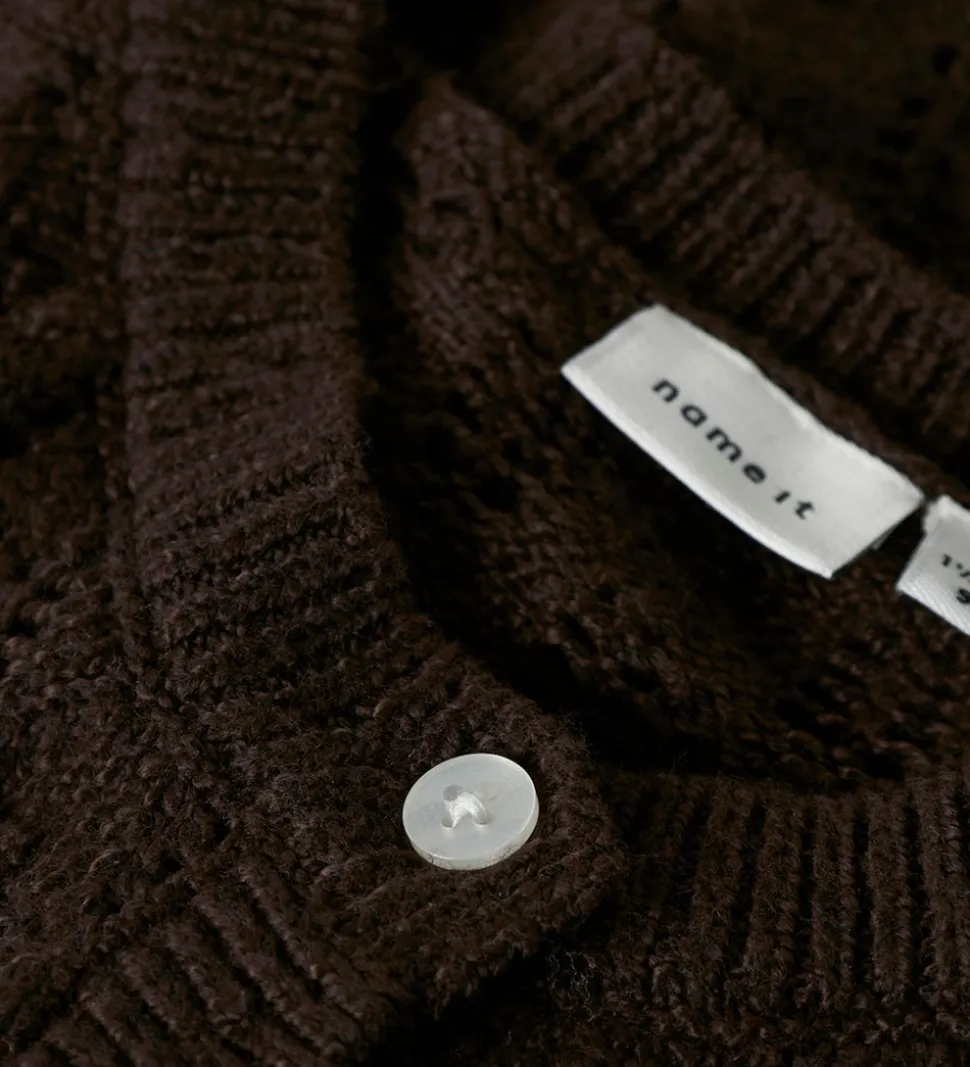 Charmerende Name It cardigan i en mørkebrun nuance med lange ærmer.