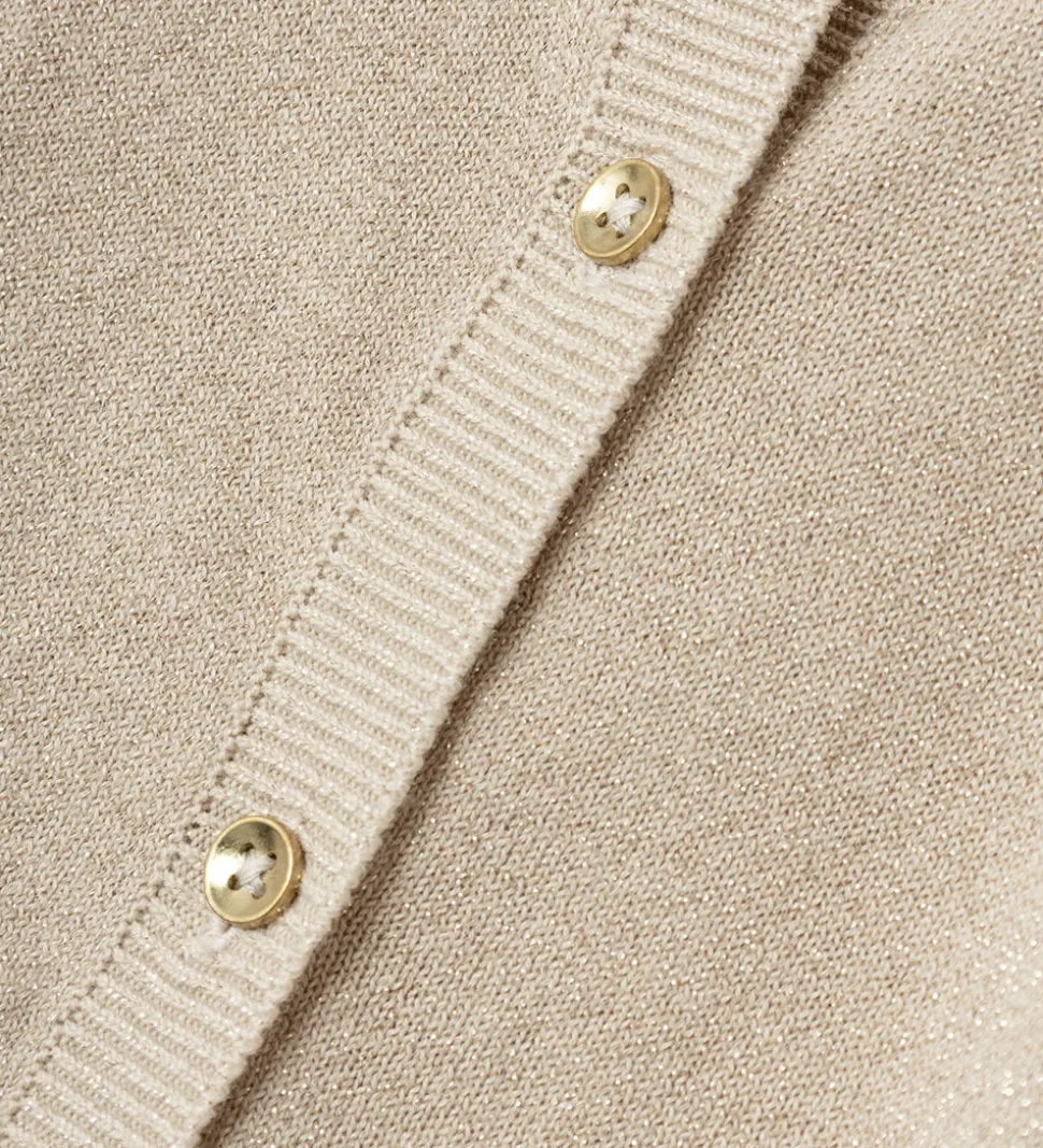 Lækker Name It cardigan i beige strik, med en flot guldfarvet glimmereffekt.