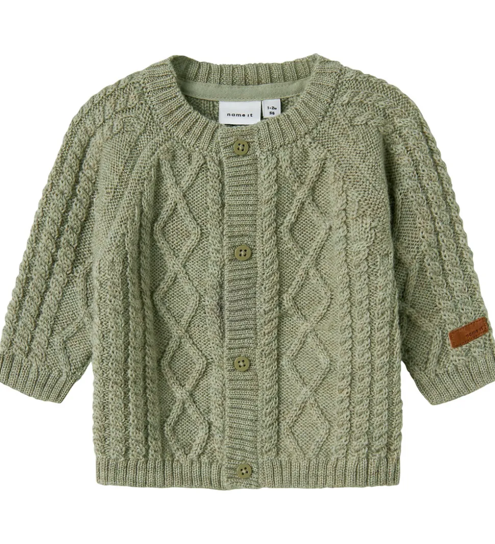 Charmerende Name It cardigan i en afdæmpet grøn nuance. Cardiganen har en flot kabelstrikket struktur. Den har en rund halsudskæring med gennemgående knaplukning fortil og lange ærmer med ribkanter i alle åbninger. Cardiganen er fremstillet i 100% merinould.
