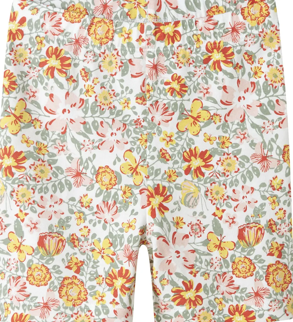 Farverige Name It cykelshorts med et livligt blomster- og sommerfugleprint i røde, gule og grønne nuancer mod en støvet hvid baggrund. Shortsene har en elastisk talje, der sikrer en god pasform.