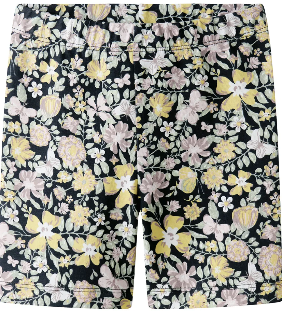 Fine Name It cykelshorts med et livligt blomster- og sommerfugleprint i røde, gule og grønne nuancer mod en støvet mørkeblå baggrund. Shortsene har en elastisk talje, der sikrer en god pasform.