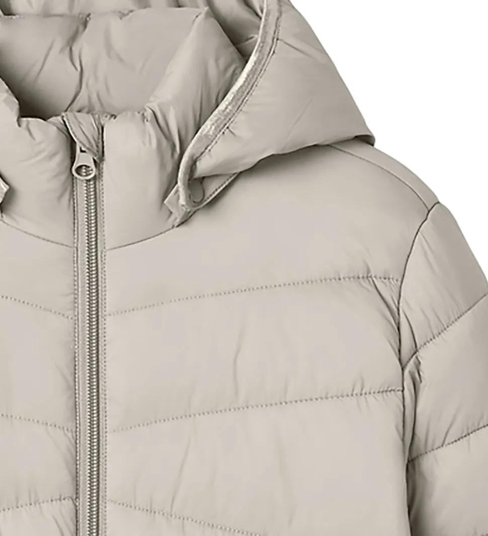 Elegant Name It dynejakke i en stilren beige nuance. Dynejakken har et quiltet design, hvor syningerne danner brede, vandrette paneler, der skaber et klassisk look.