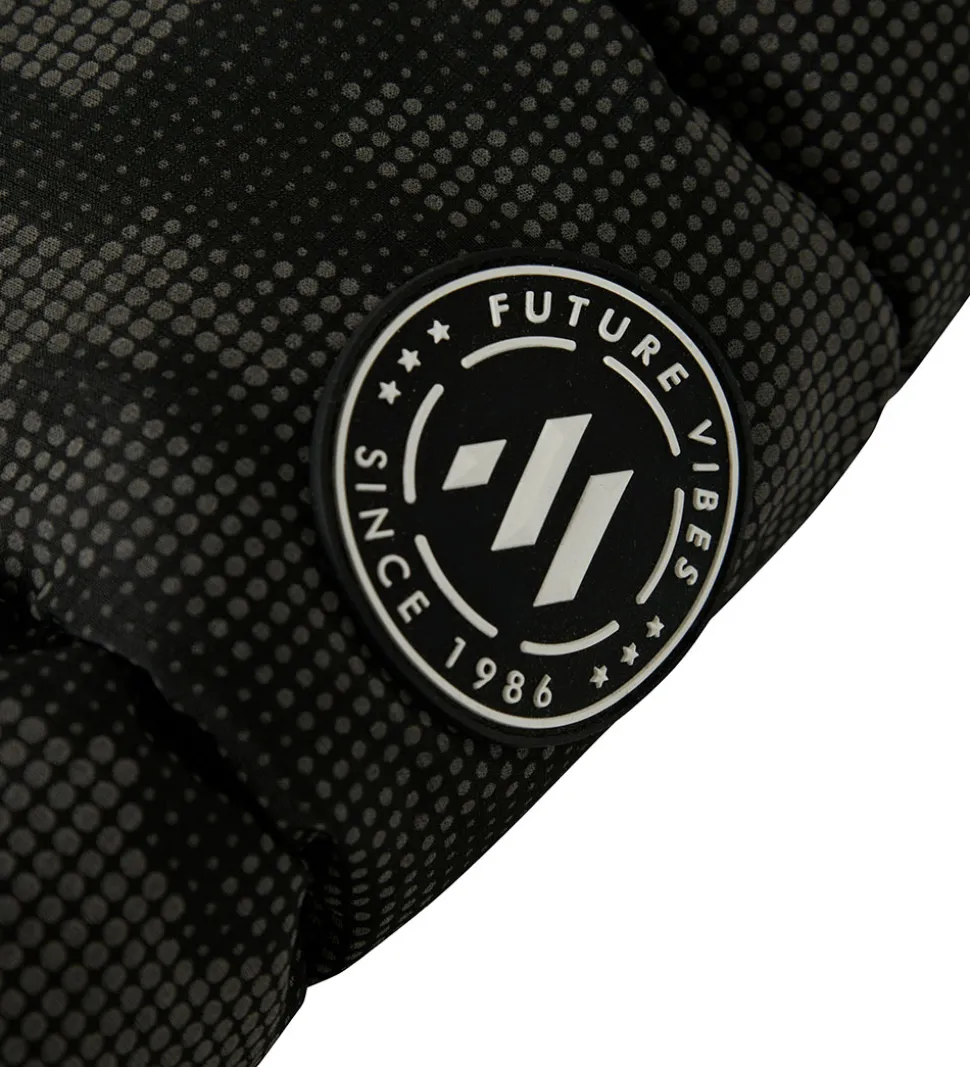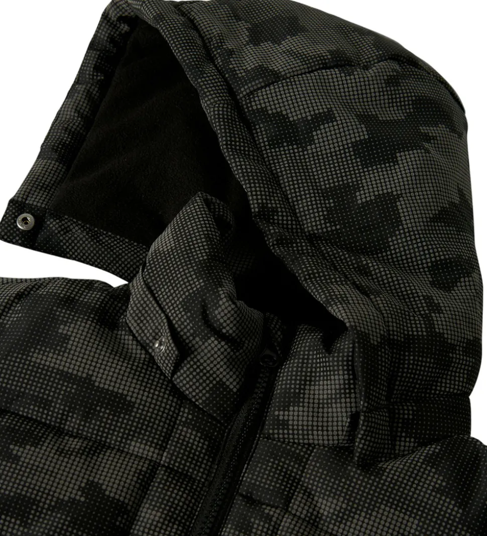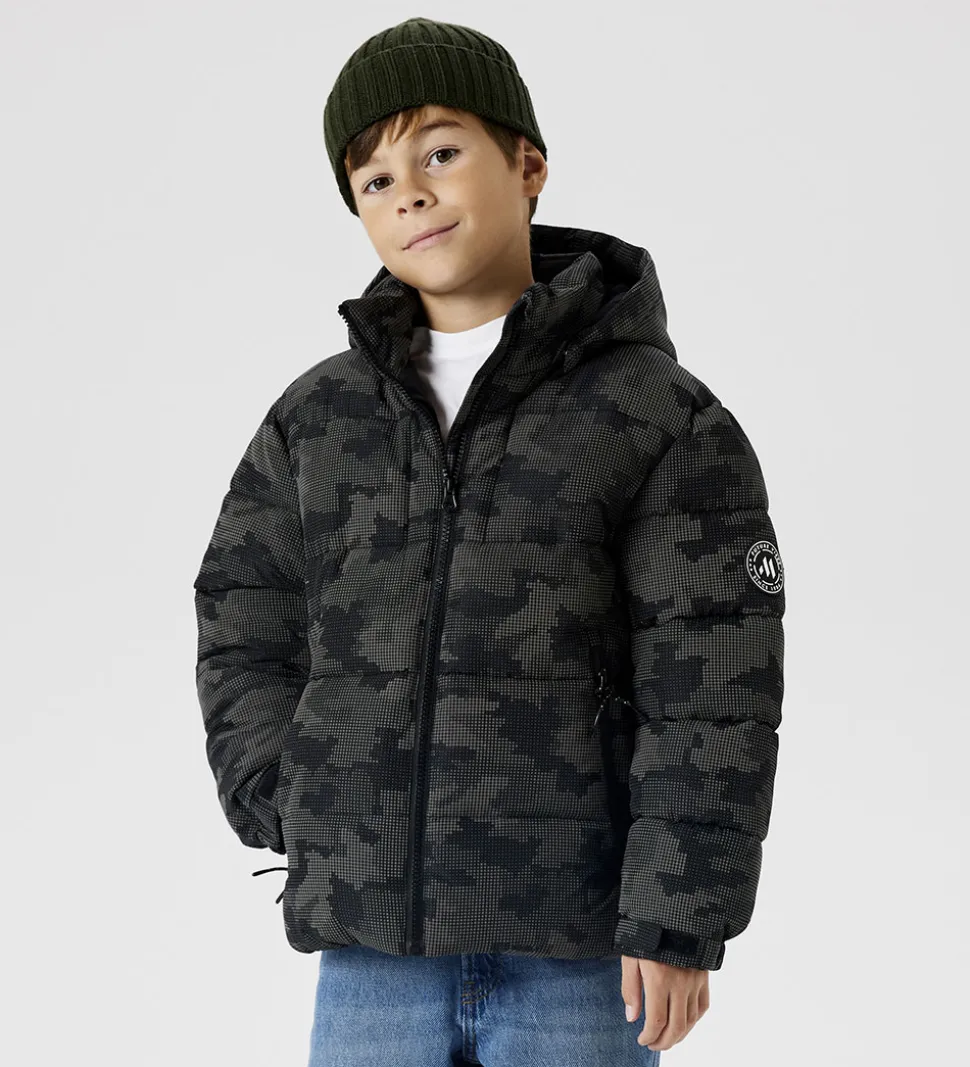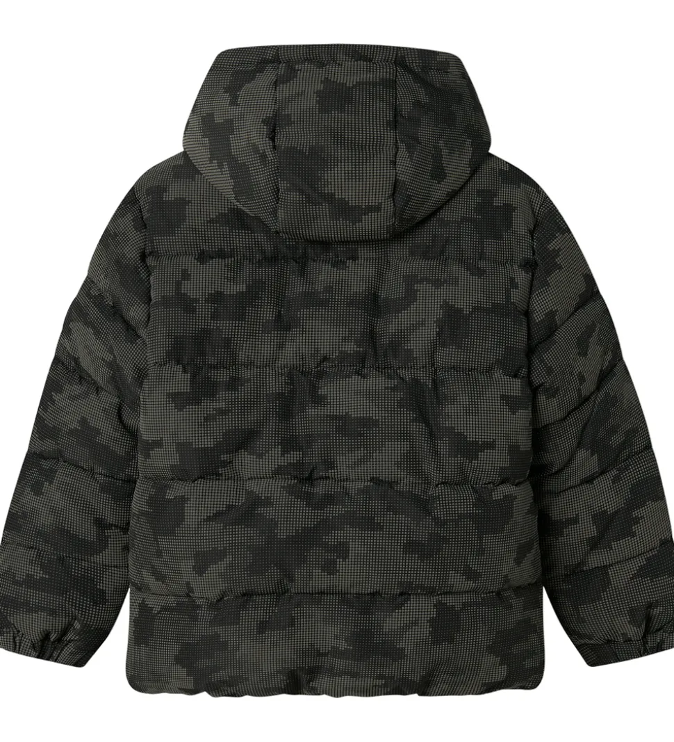 Flot Name It dynejakke i sort med et camouflagemønster som refleksprint. Dynejakkens struktur er både stilfuld og funktionel med et quiltet design, der giver et puffy look.
