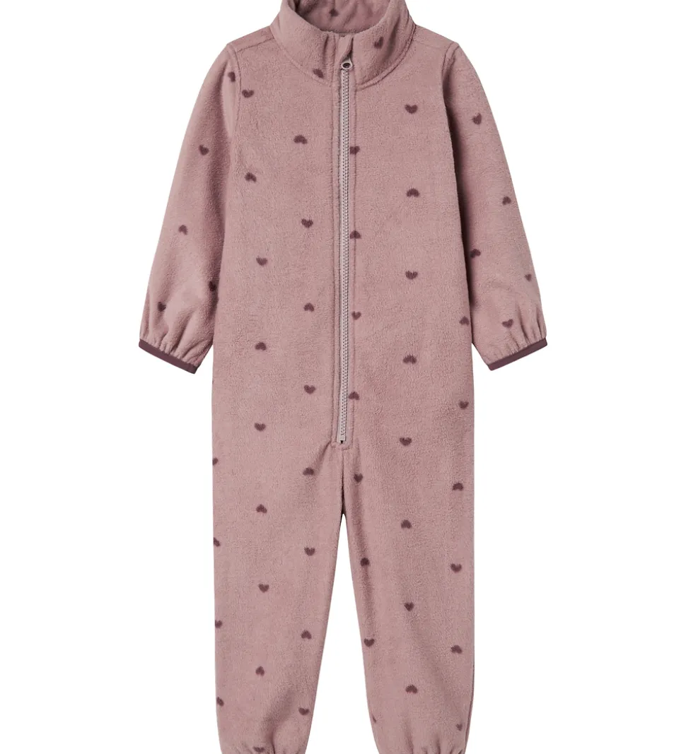 Blød Name It fleecedragt i en varm rosa nuance med små mørkelilla hjerter.