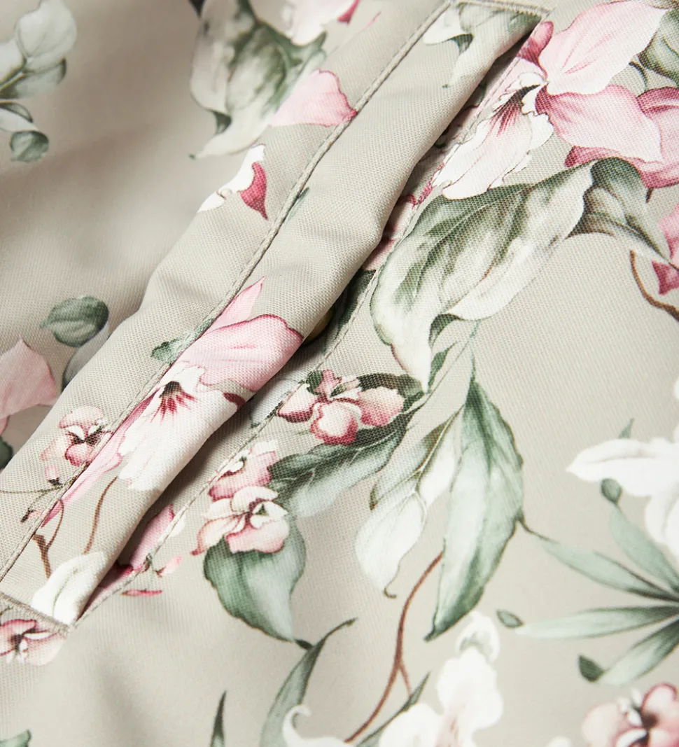 Skøn Name It flyverdragt i lysegrøn med et alloverprint af blomster i rosa, hvide og grønne nuancer. Flyverdragten har praktiske refleksdetaljer.