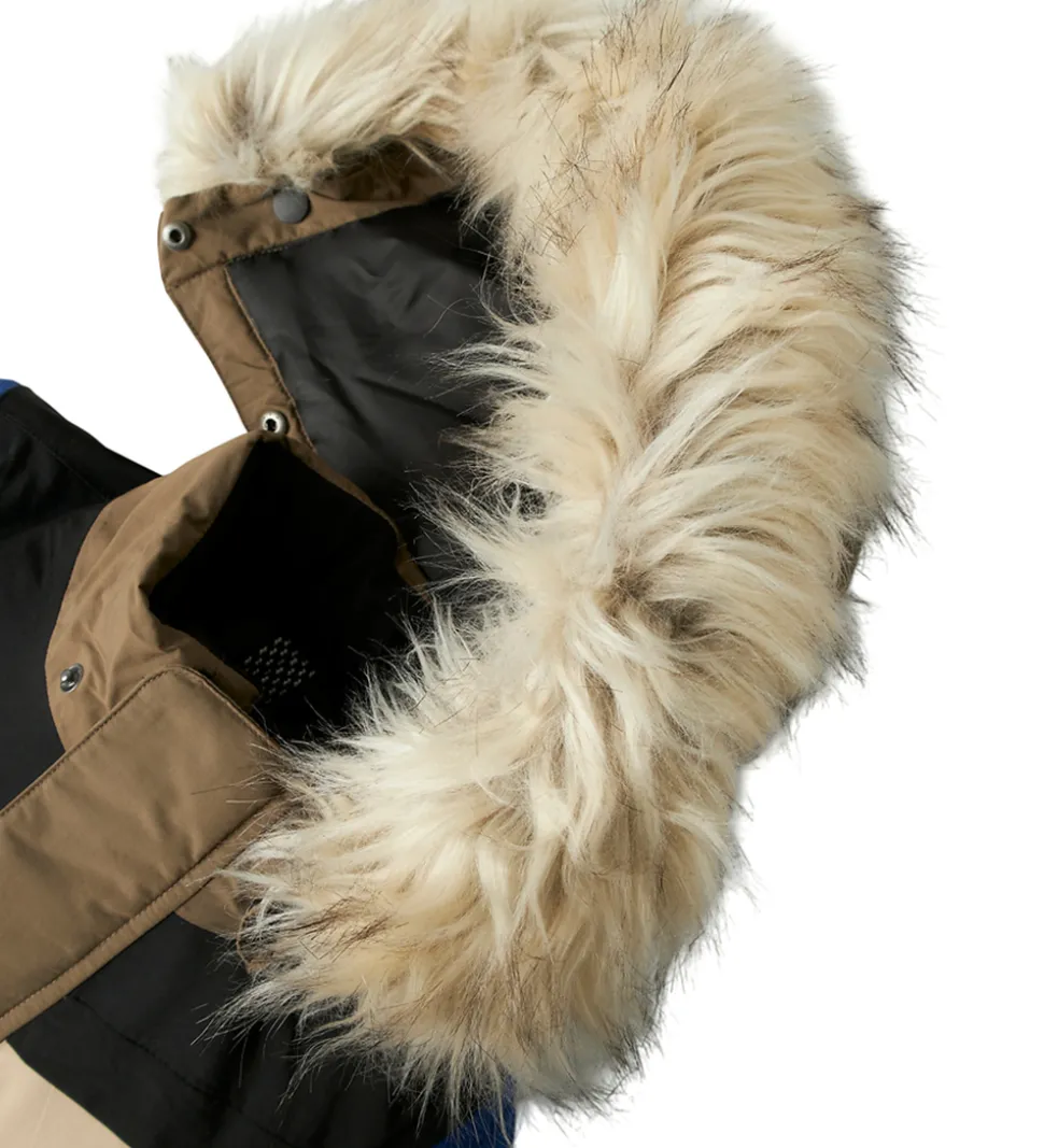 Name It flyverdragten har en aftagelig hætte, som sidder fast med skjulte trykknapper, og den har en flot kant af imiteret pels, som sidder fast med trykknapper. Hættens ansigtsåbning har en indvendig elastikkant af fleece. Ærmerne har elastikkanter med snefang og hul til tommelfingrene. I benåbningerne er der elastikkanter med velcro og trykknapper på ydersiden. Indvendigt i benåbningerne er der snefang og aftagelige, justerbare gummistropper, som kan sættes under fodtøjet.