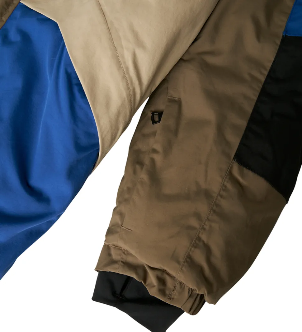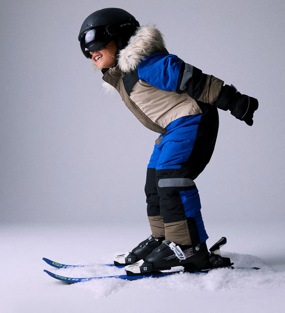 Name It flyverdragten lukkes fortil med en lynlås med hagebeskytter og dobbelt vindstolpe, hvoraf den yderste kan lukkes med velcro. Indvendigt er der glatvævet for og seler, som kan tages over skuldrene. Flyverdragten er godt vatteret og har ekstra isolering ved bagdelen.