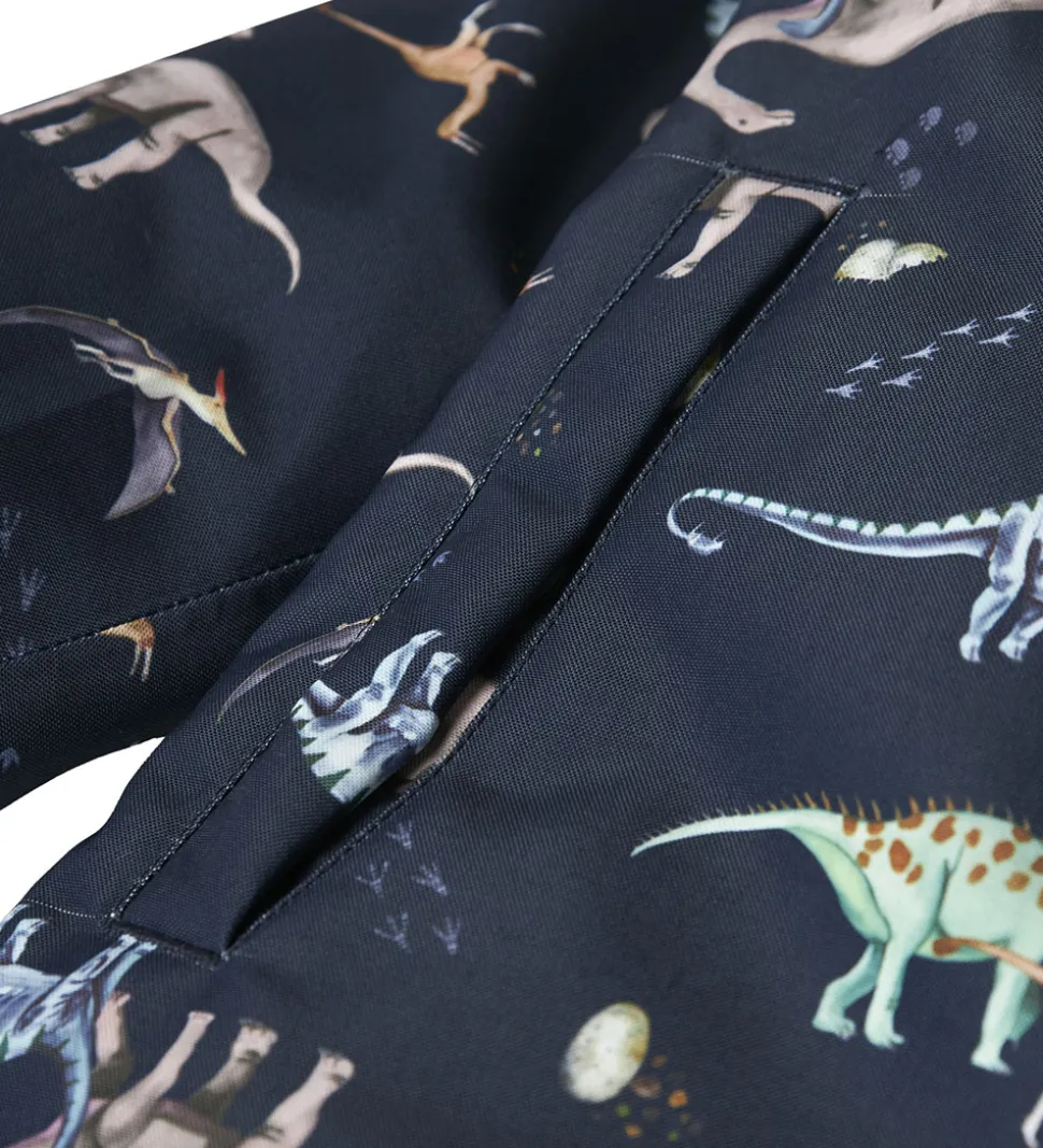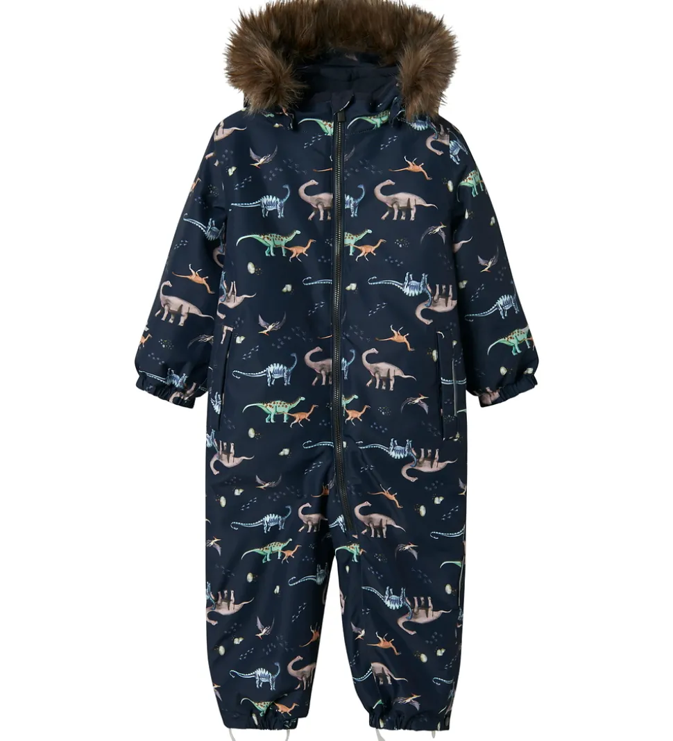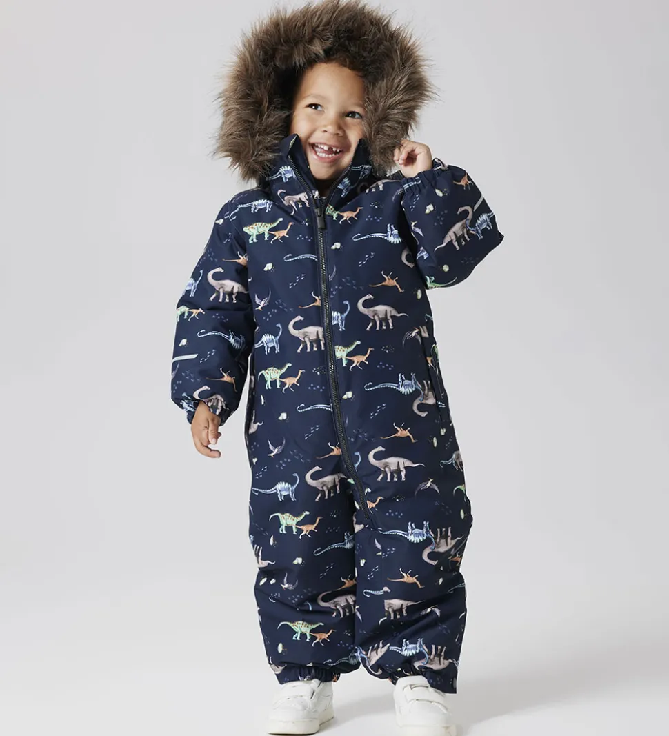 Fed Name It flyverdragt i navyblå med et farverigt alloverprint af dinosaurer.