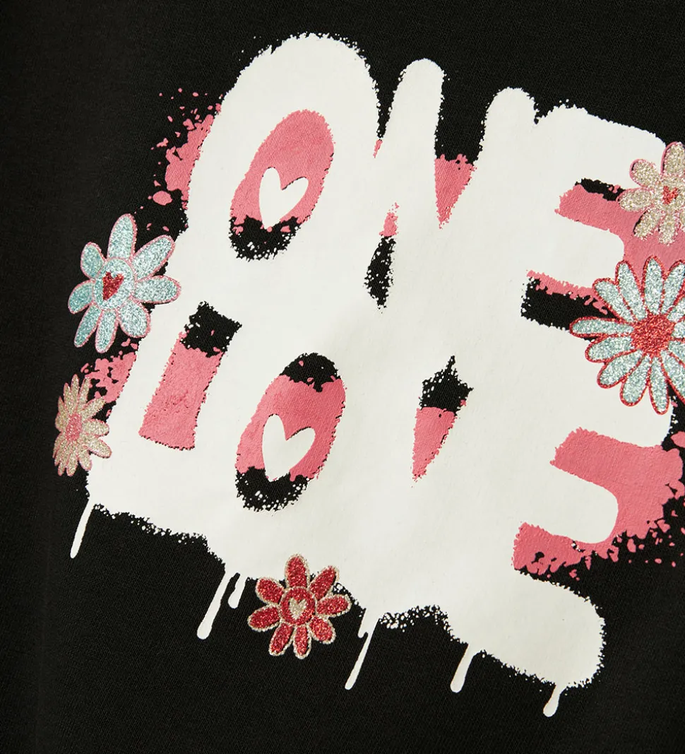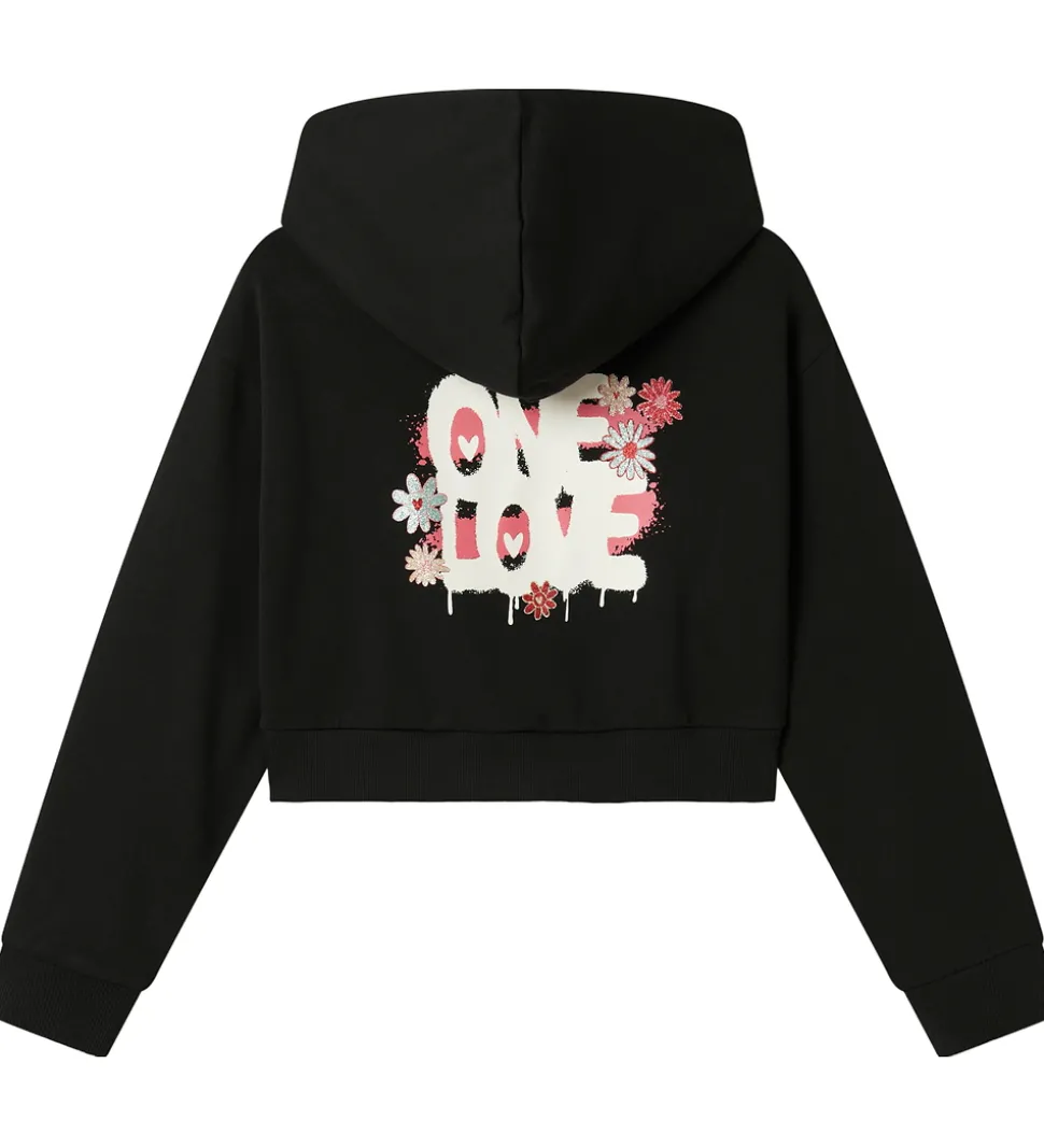 Stilfuld Name It hættetrøje i sort med et glimmerprint på venstre bryst af en blomst i blå, rosa og rød. På ryggen er der et stort print i hvid, pink og blå nuancer med teksten “One Love” og blomster i glimmer.