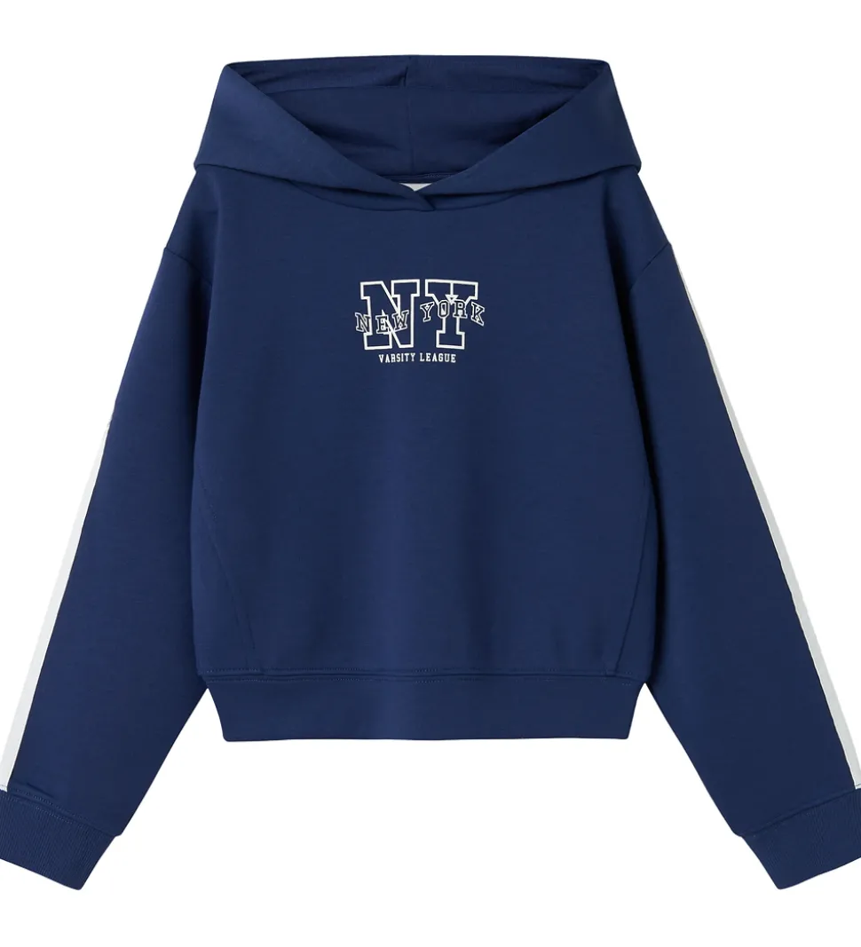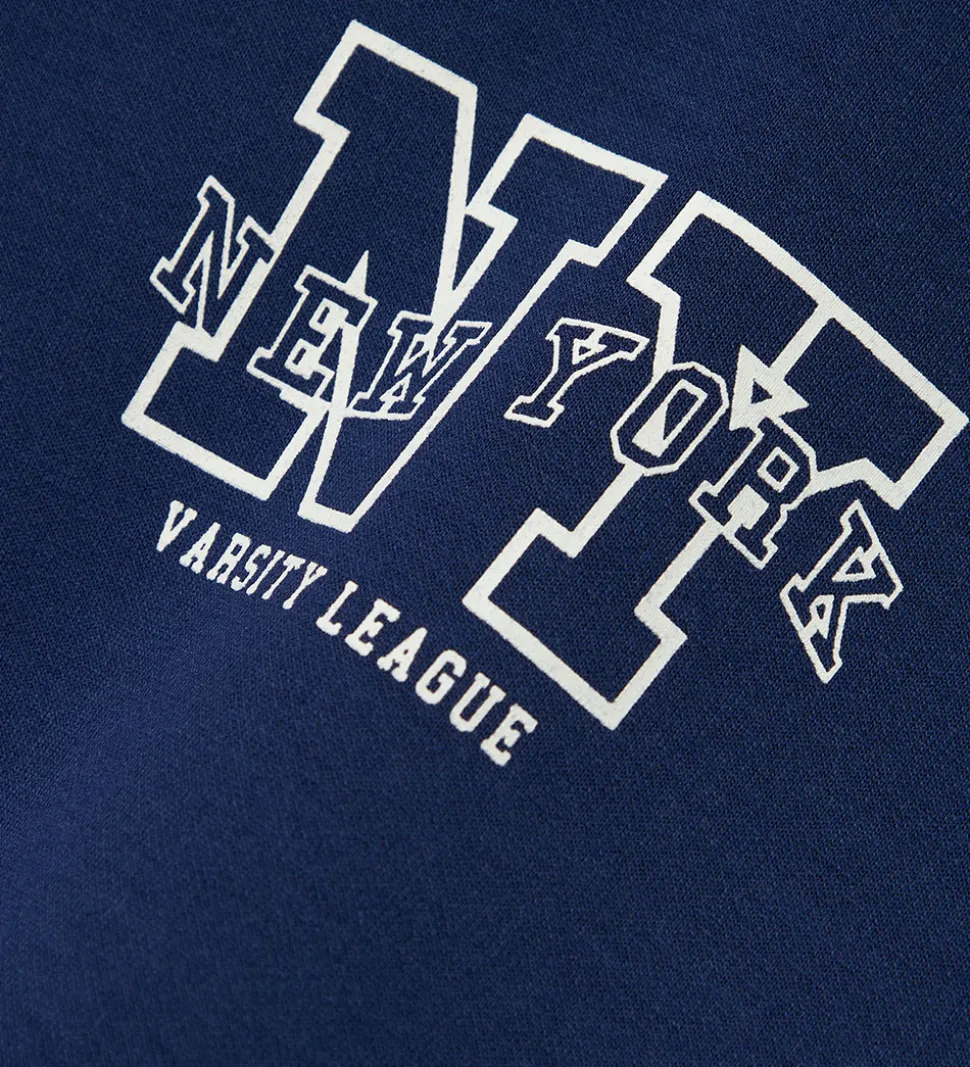 Smart Name It hættetrøje i en dyb blå farve. Hættetrøjen har et markant hvidt tryk på brystet med teksten “New York Varsity League”. Langs ærmerne ses en kontraststribe, der tilføjer et moderne touch. Name It hættetrøjen har ribkanter ved håndleddene og i bunden for optimal pasform. Hættetrøjen er fremstillet i en lækker blød, sporty kvalitet.